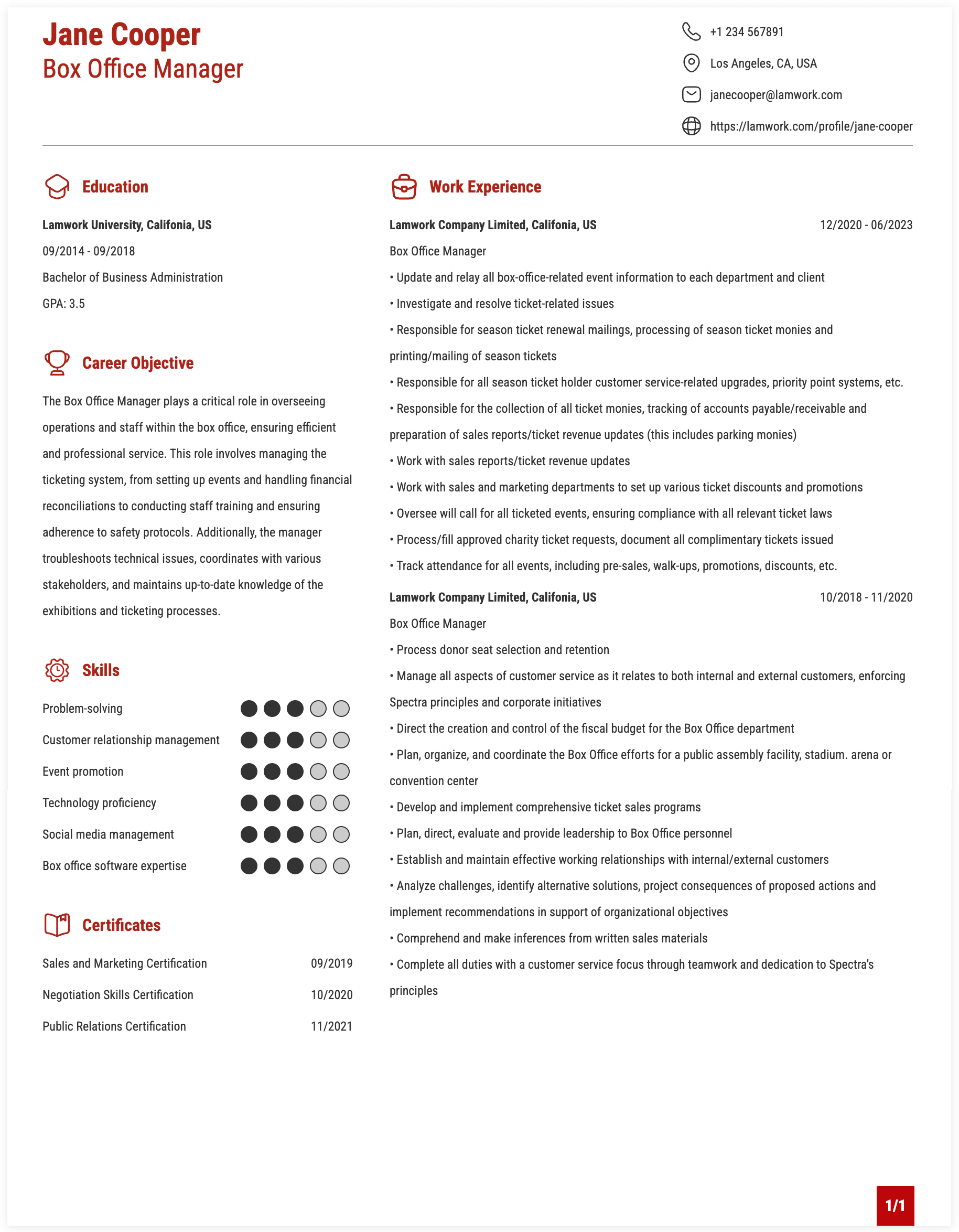 - Ensures professionalism, accuracy, and efficiency throughout Box Office staff/operations