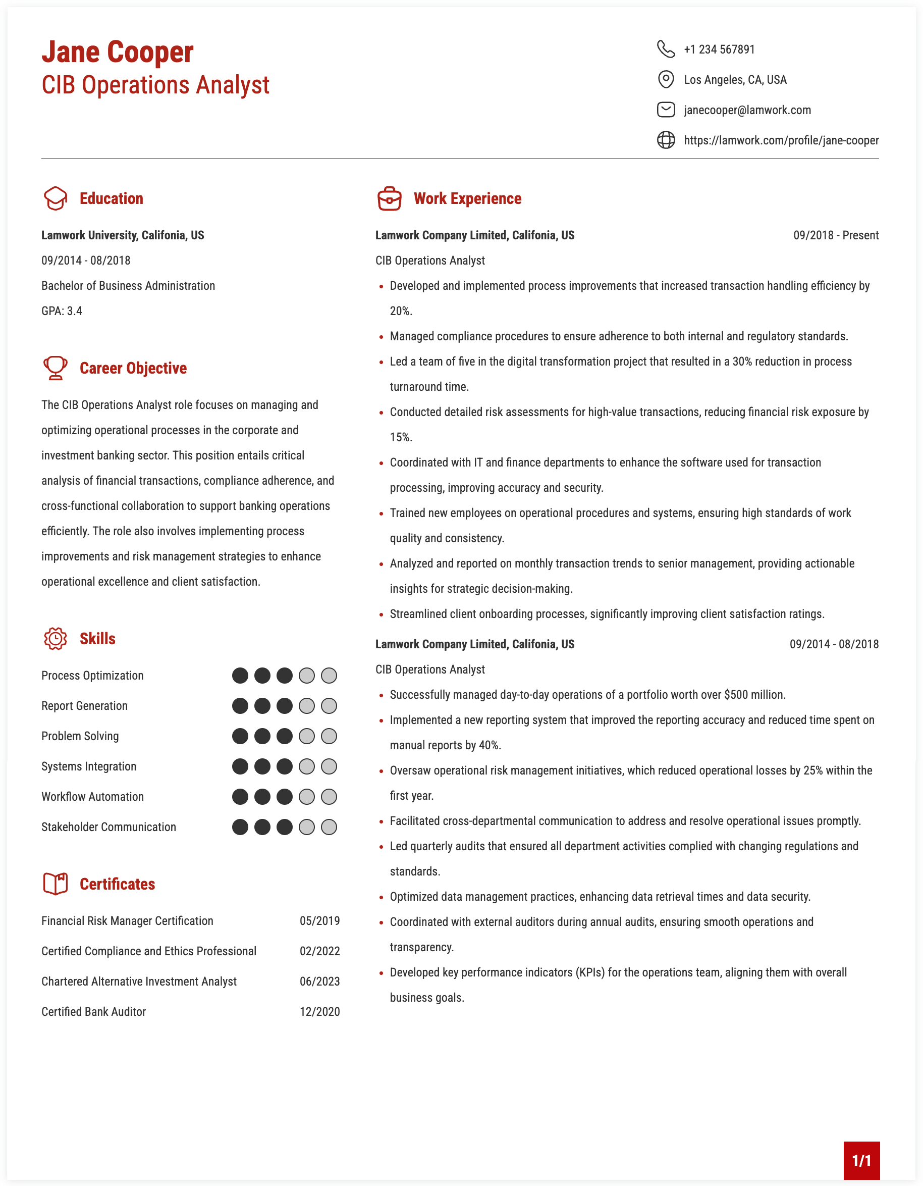 CIB OPERATIONS ANALYST RESUME EXAMPLE