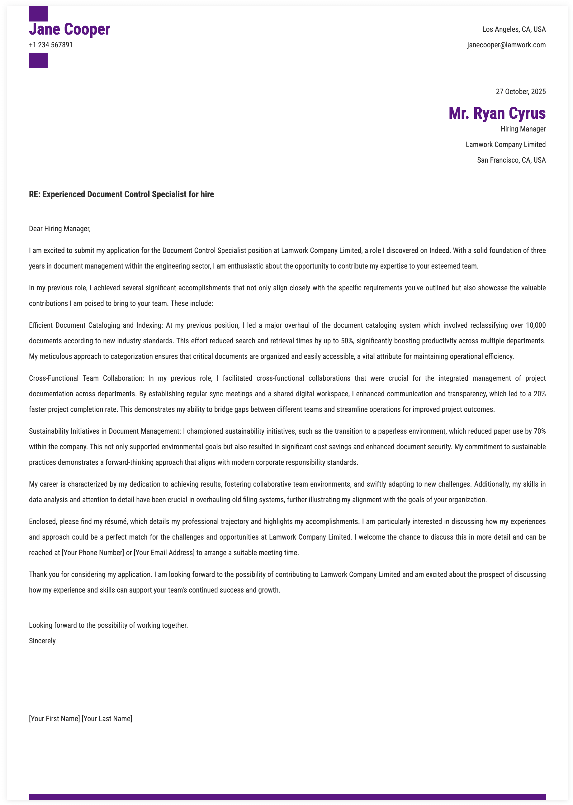 3. Key Deliverables for Document Control Specialist Cover Letter