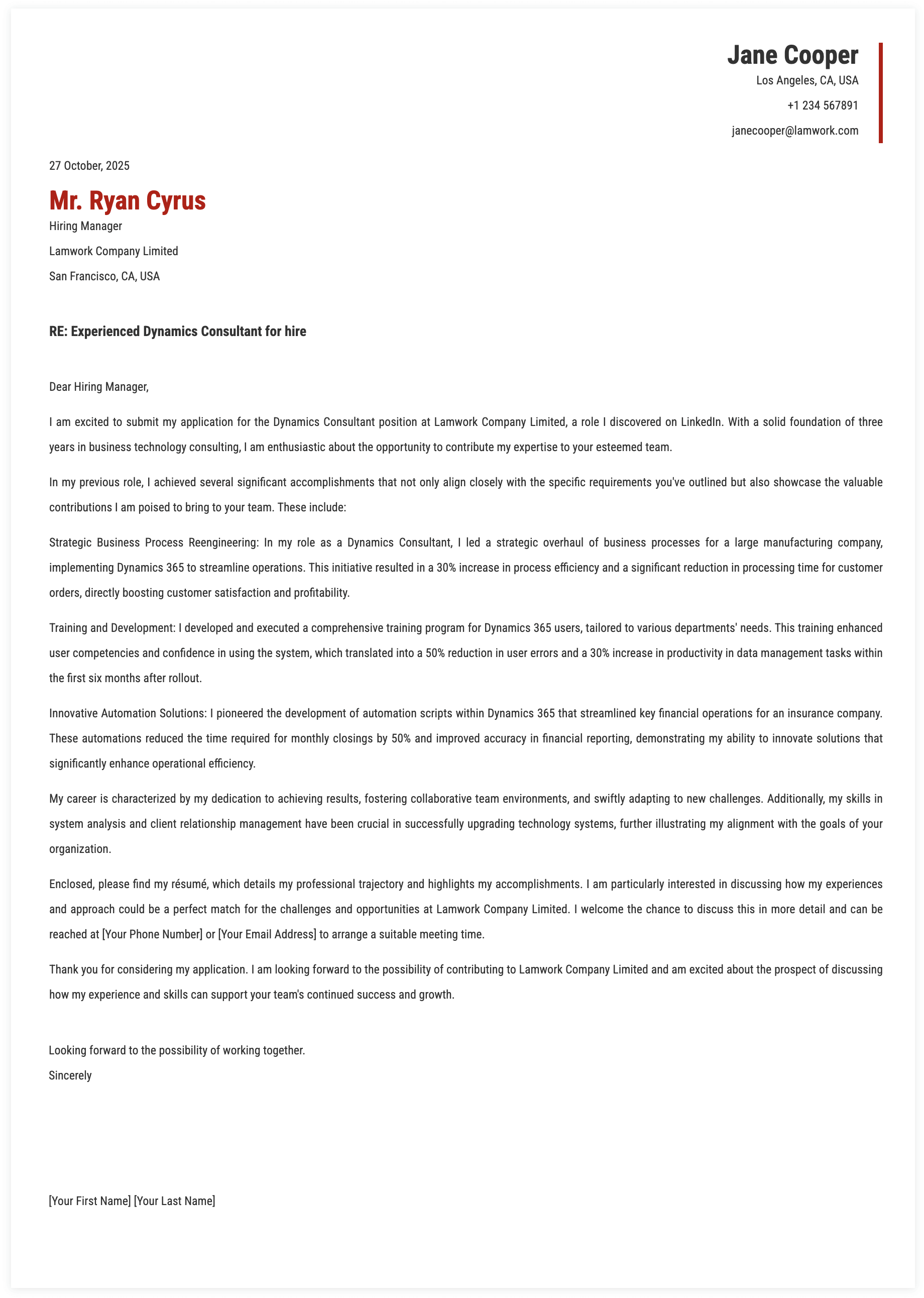 2. Experience and Requirements for Dynamics Consultant Cover Letter