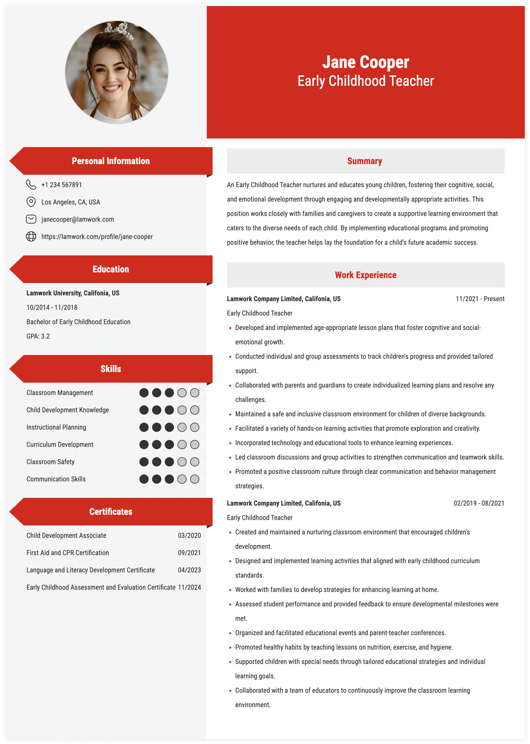 EARLY CHILDHOOD TEACHER RESUME EXAMPLE