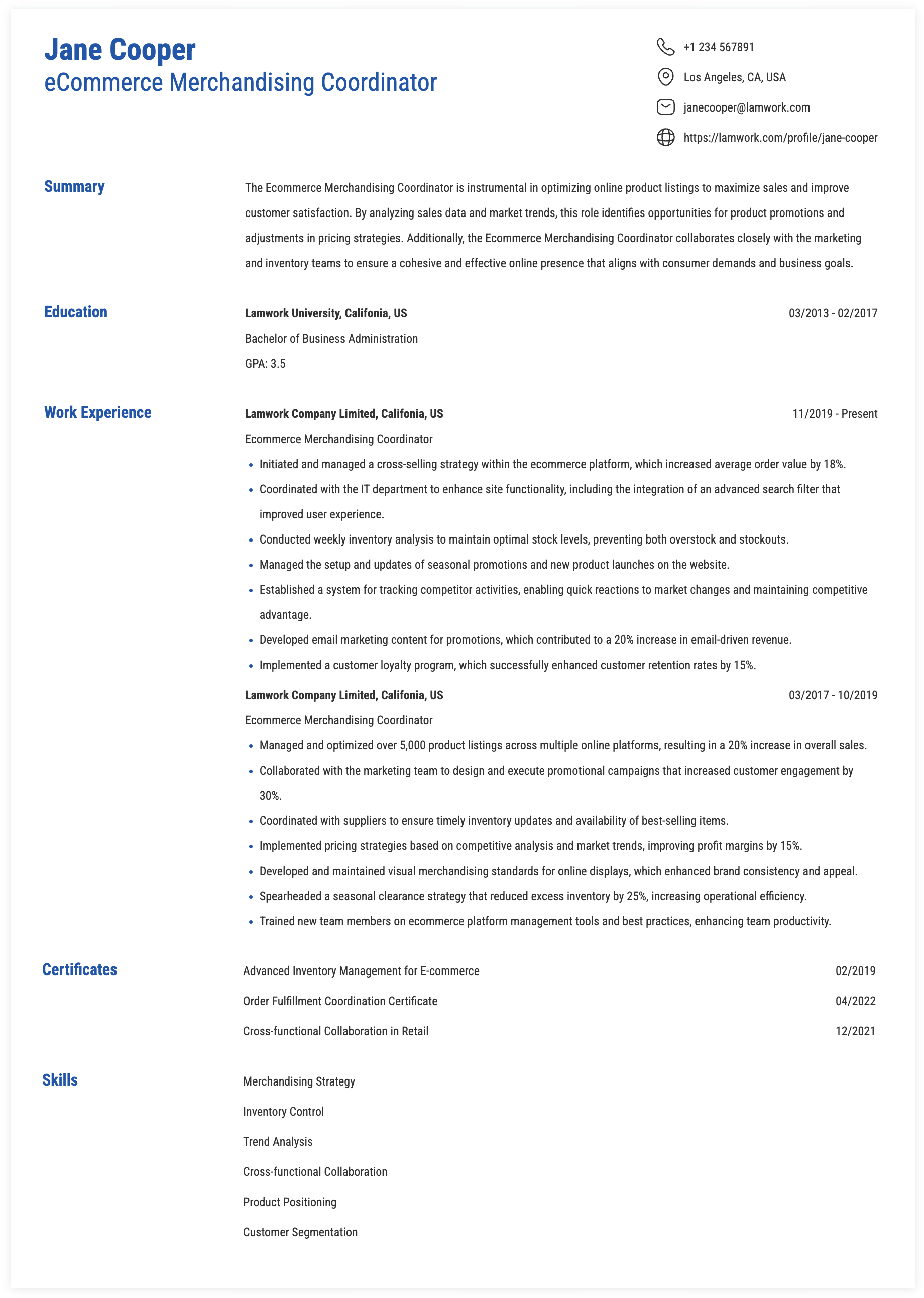 ECOMMERCE MERCHANDISING COORDINATOR RESUME EXAMPLE