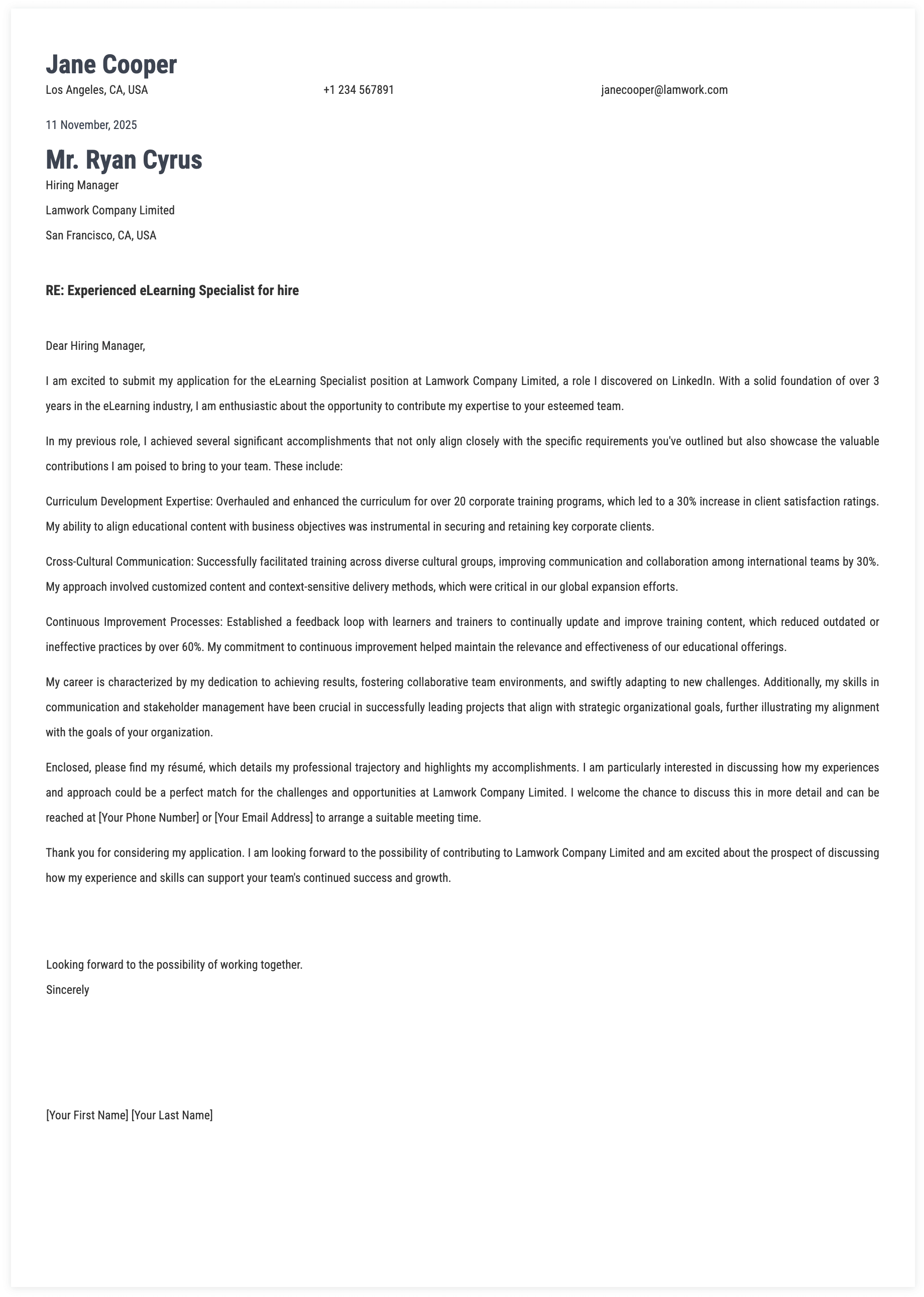 A strong cover letter clearly explains your interest in the role and highlights relevant achievements from your experience. Tools like Lamwork can help structure the document effectively.