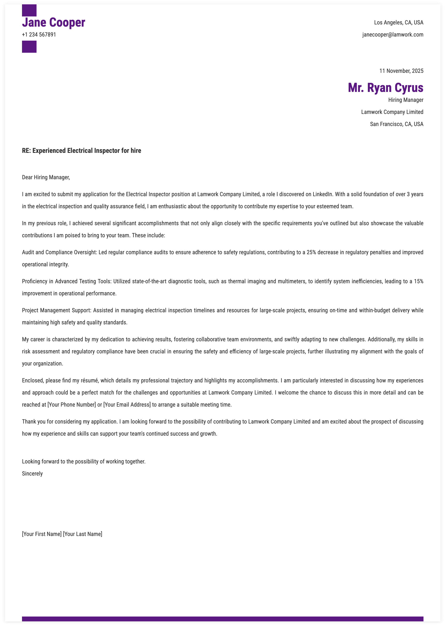 2. Roles for Lead Electrical Inspector Cover Letter