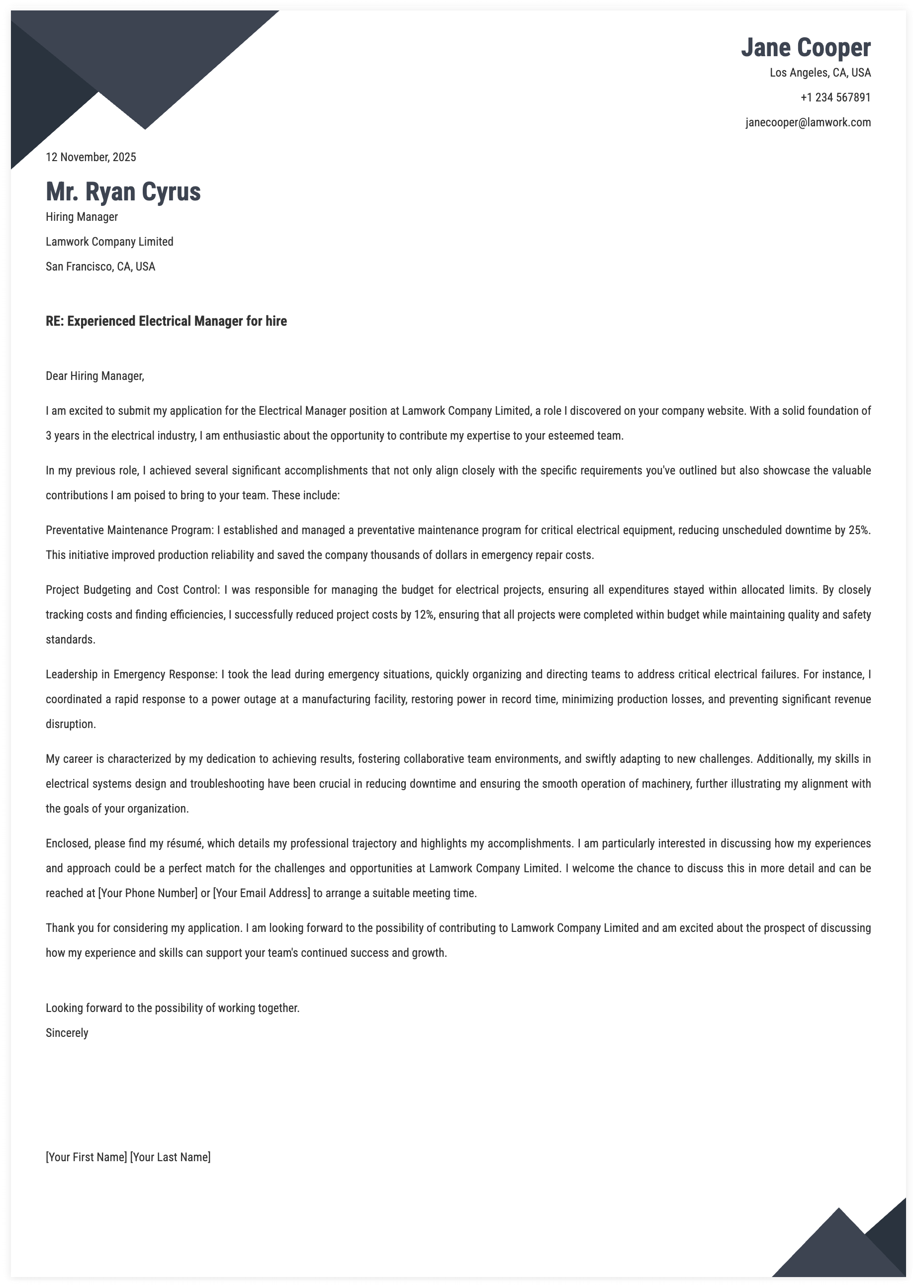 1. Details for Electrical Manager Cover Letter