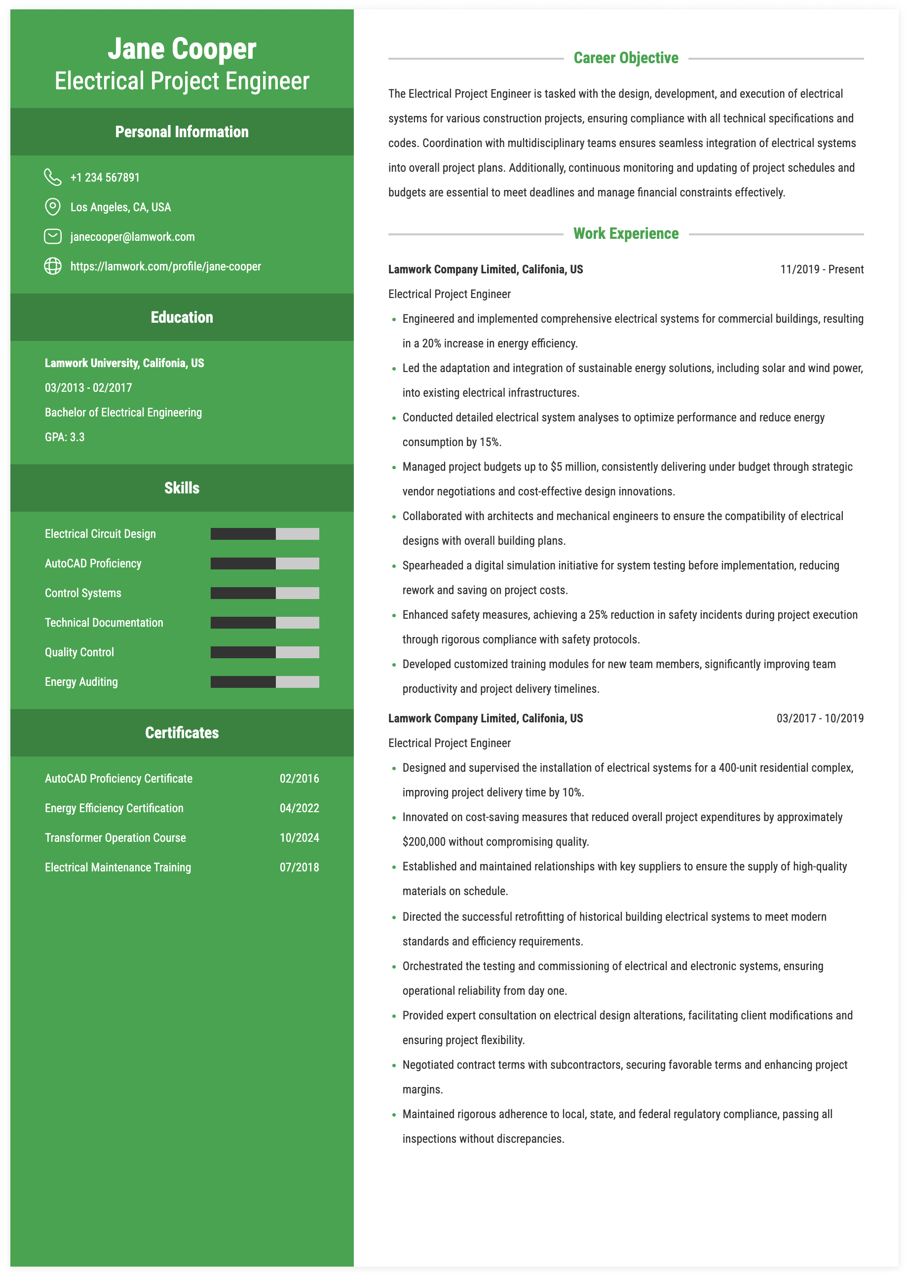 ELECTRICAL PROJECT ENGINEER RESUME EXAMPLE