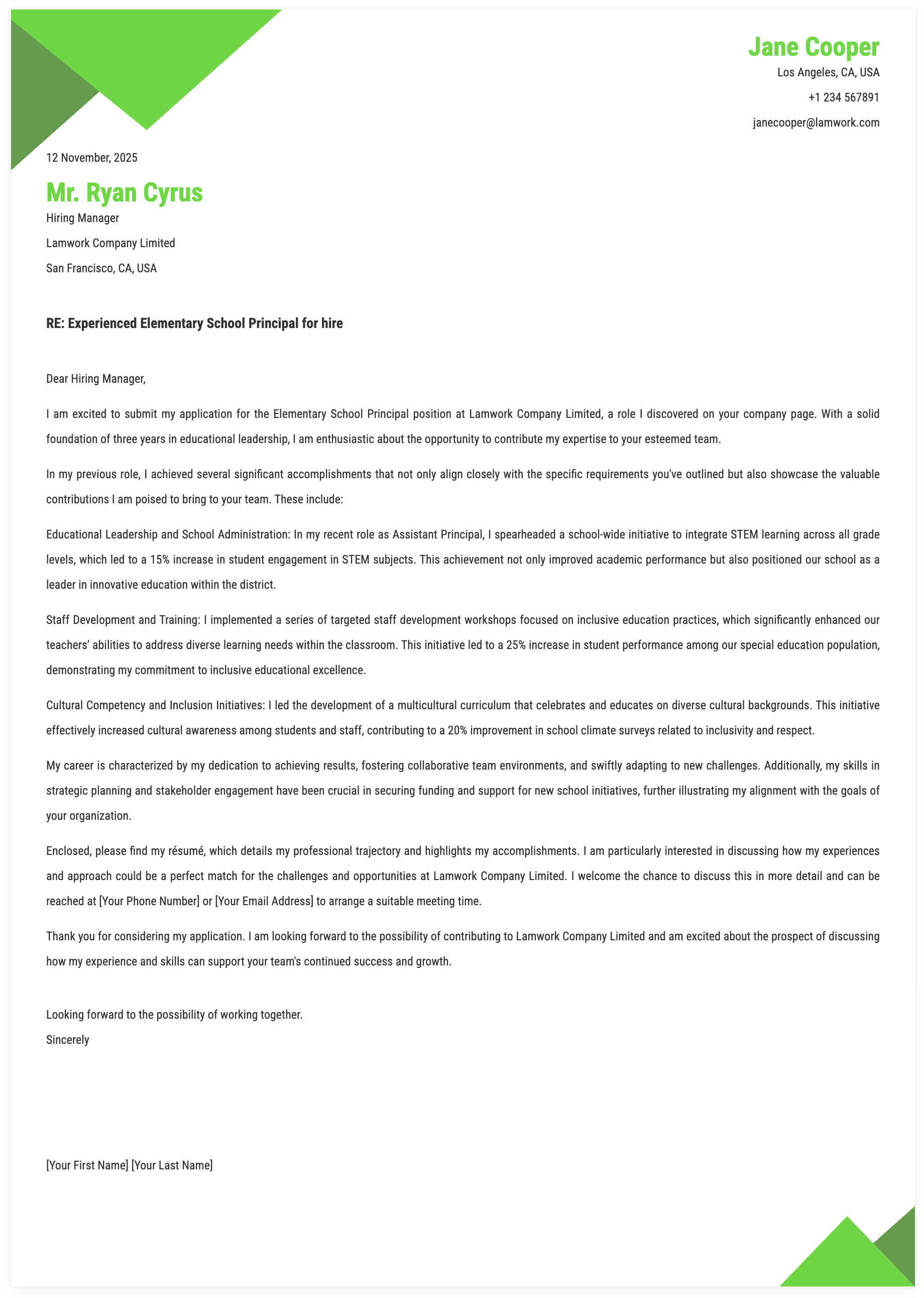 ELEMENTARY SCHOOL PRINCIPAL COVER LETTER TEMPLATE