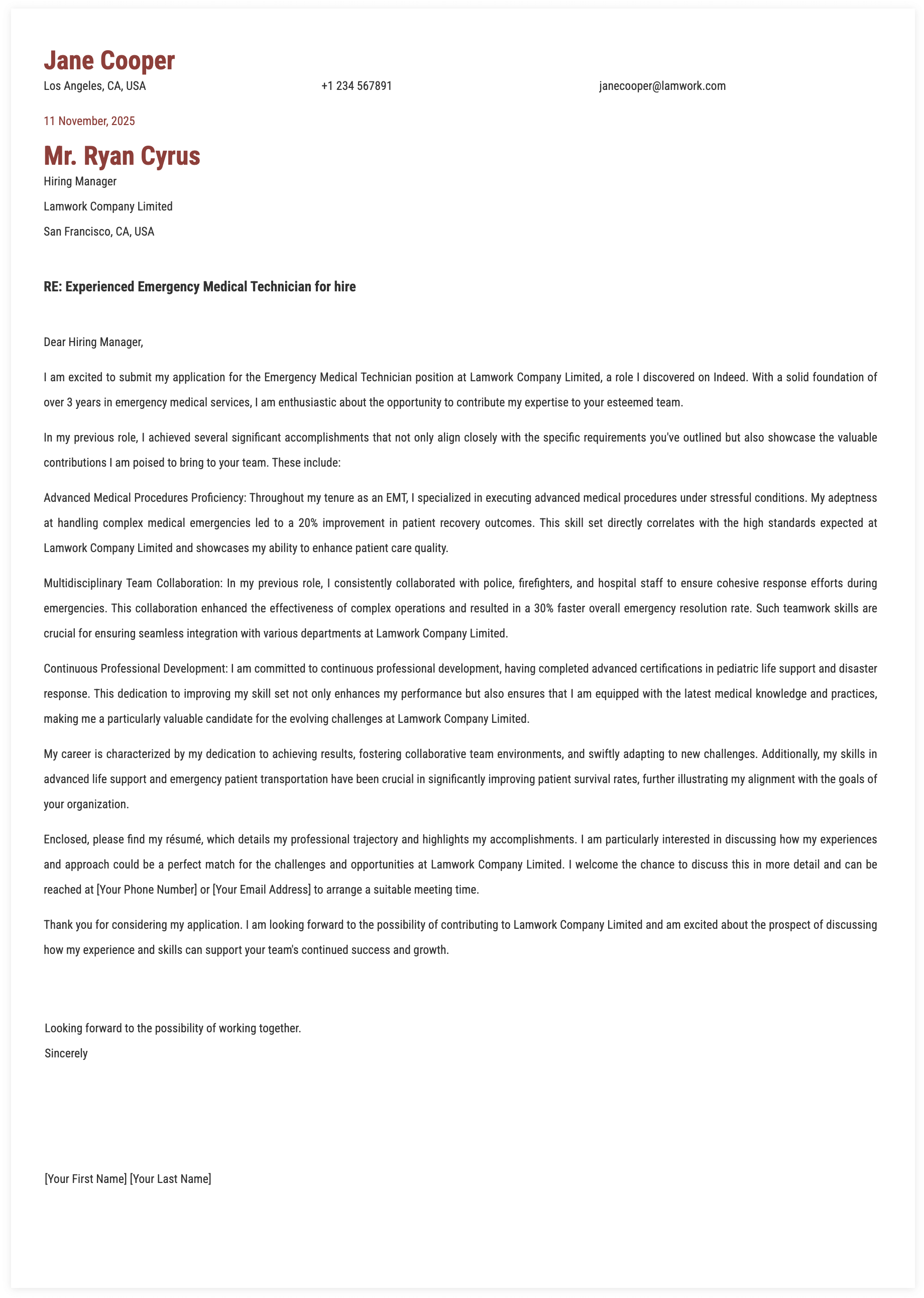 What Are the Qualifications and Requirements for Emergency Medical Technician in a Cover Letter?