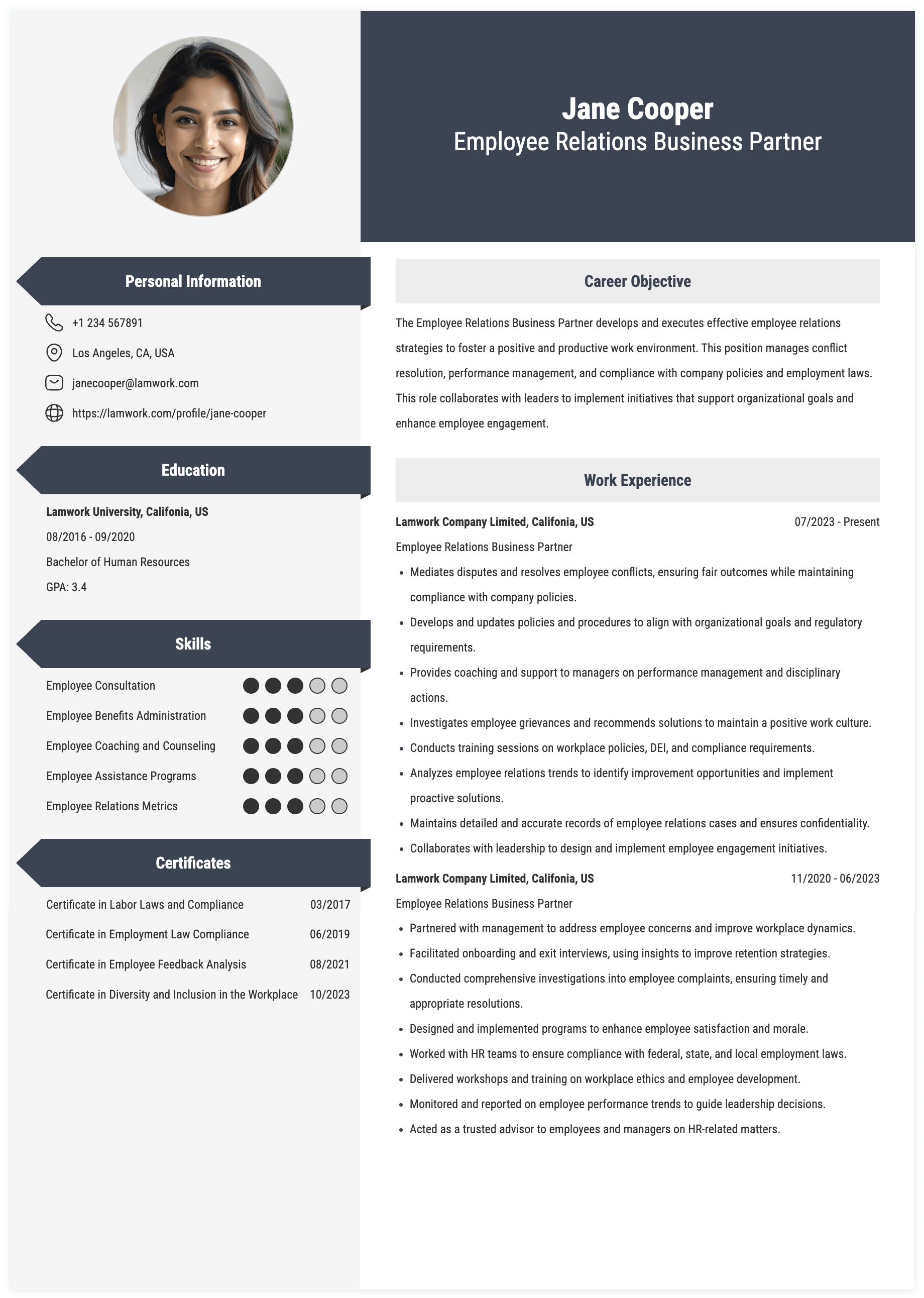 EMPLOYEE RELATIONS BUSINESS PARTNER RESUME EXAMPLE