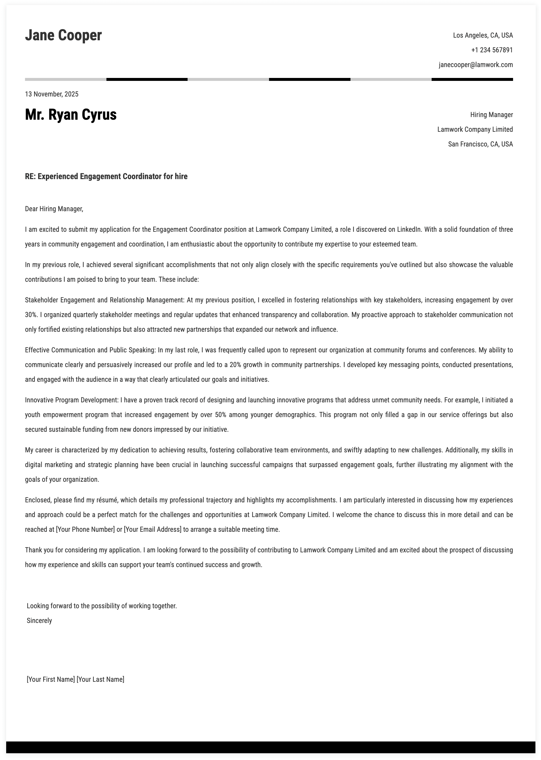 What Are the Qualifications and Requirements for Engagement Coordinator in a Cover Letter?