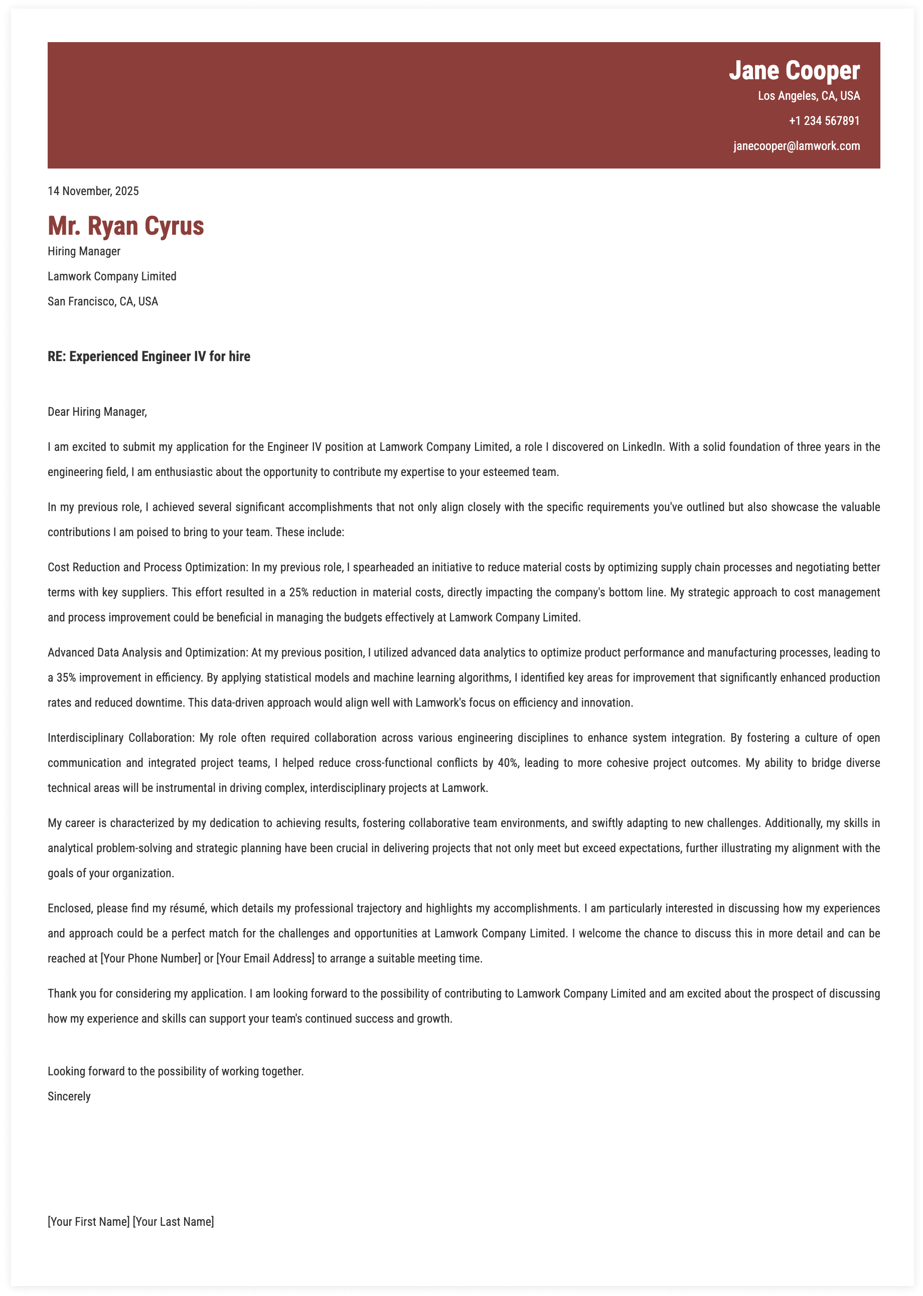 What Are the Qualifications and Requirements for Engineer IV in a Cover Letter?