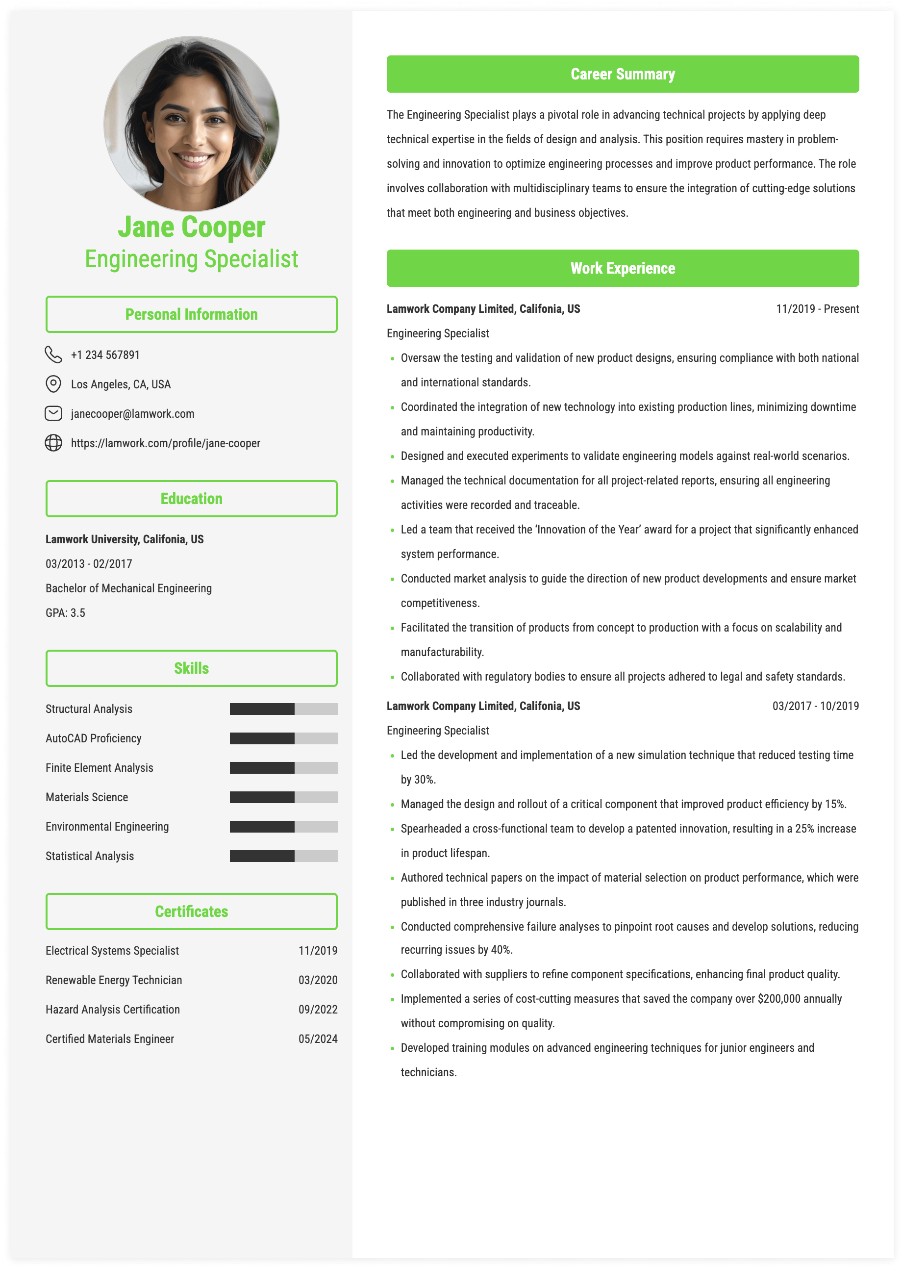 ENGINEERING SPECIALIST RESUME EXAMPLE