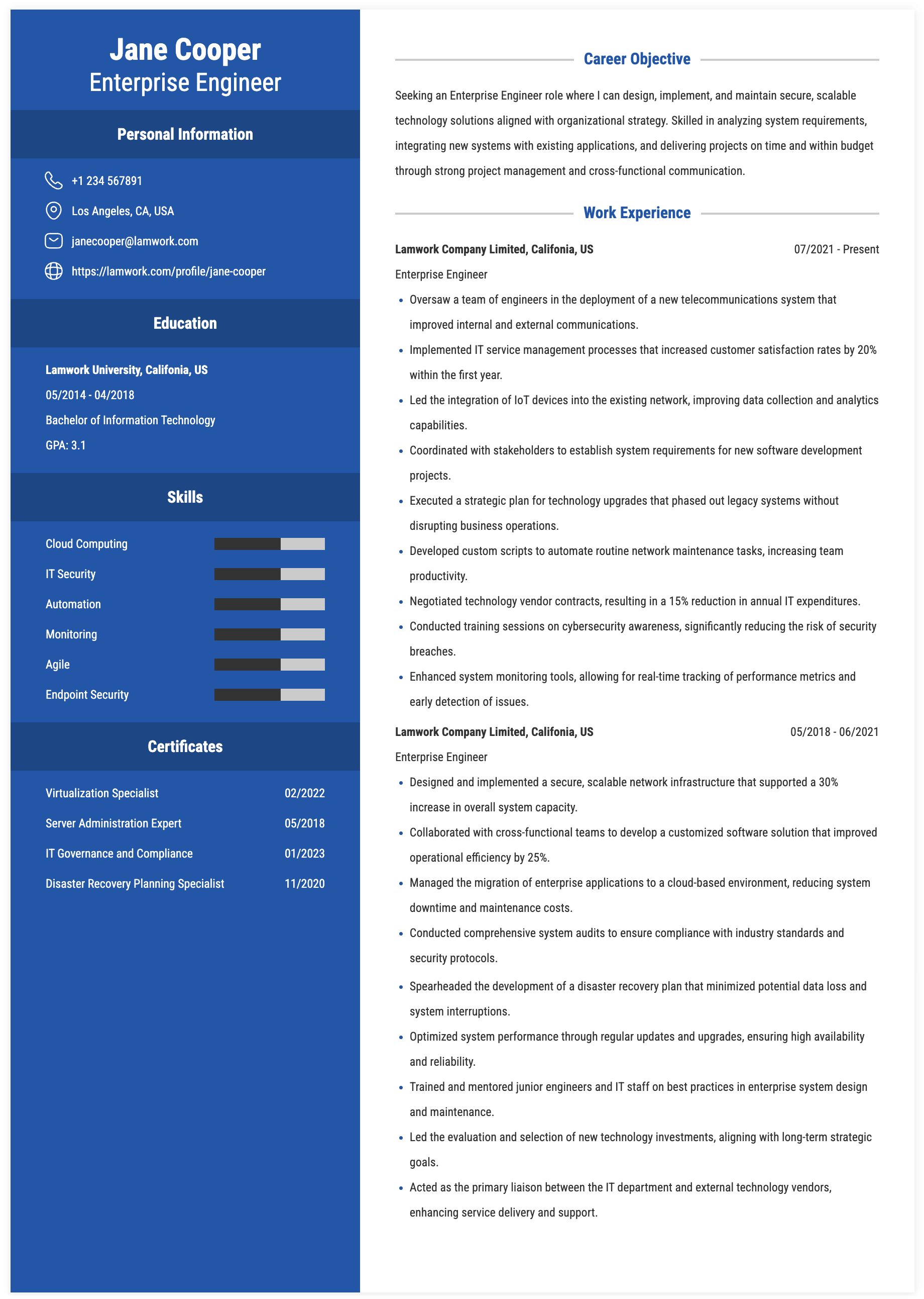 ENTERPRISE ENGINEER RESUME EXAMPLE