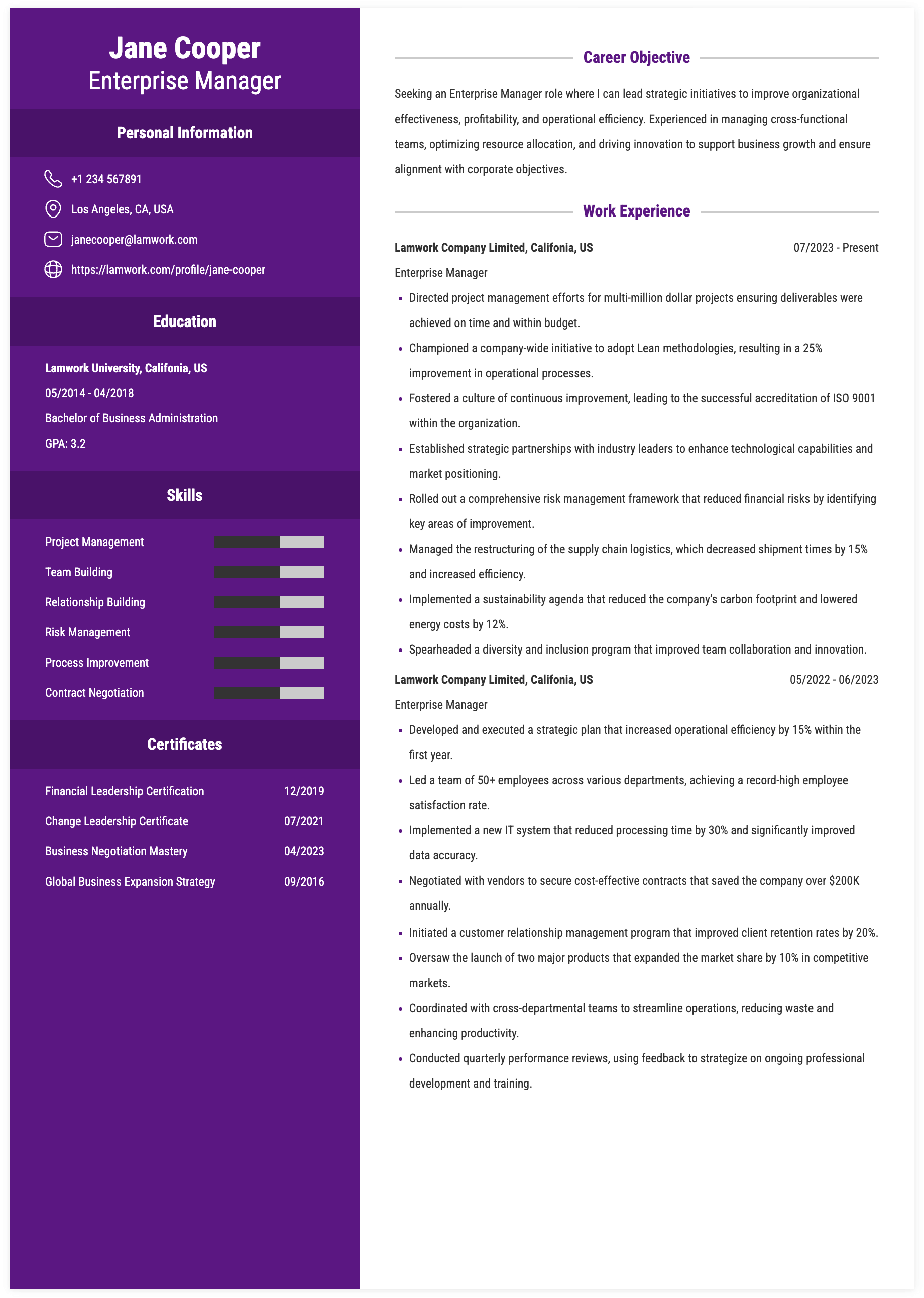 ENTERPRISE MANAGER RESUME EXAMPLE