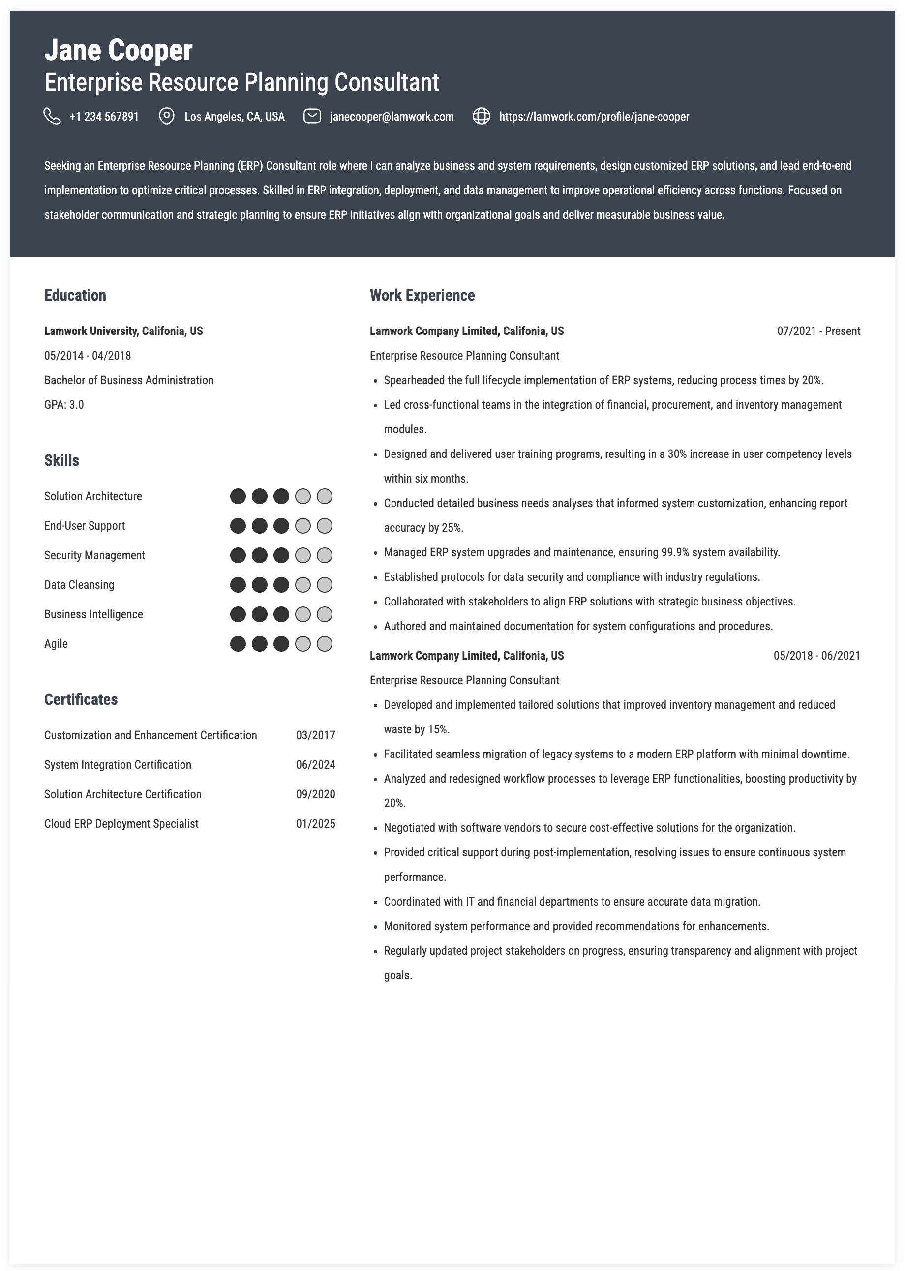 ENTERPRISE RESOURCE PLANNING CONSULTANT RESUME EXAMPLE