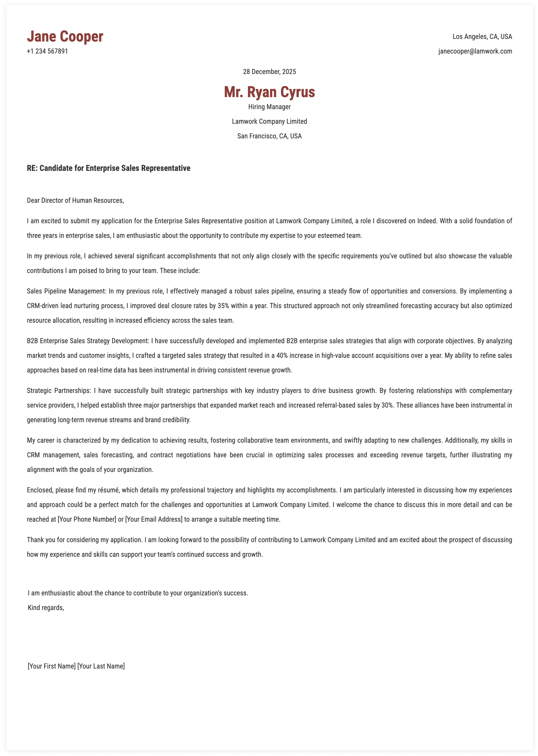 1. Details for Enterprise Sales Representative Cover Letter