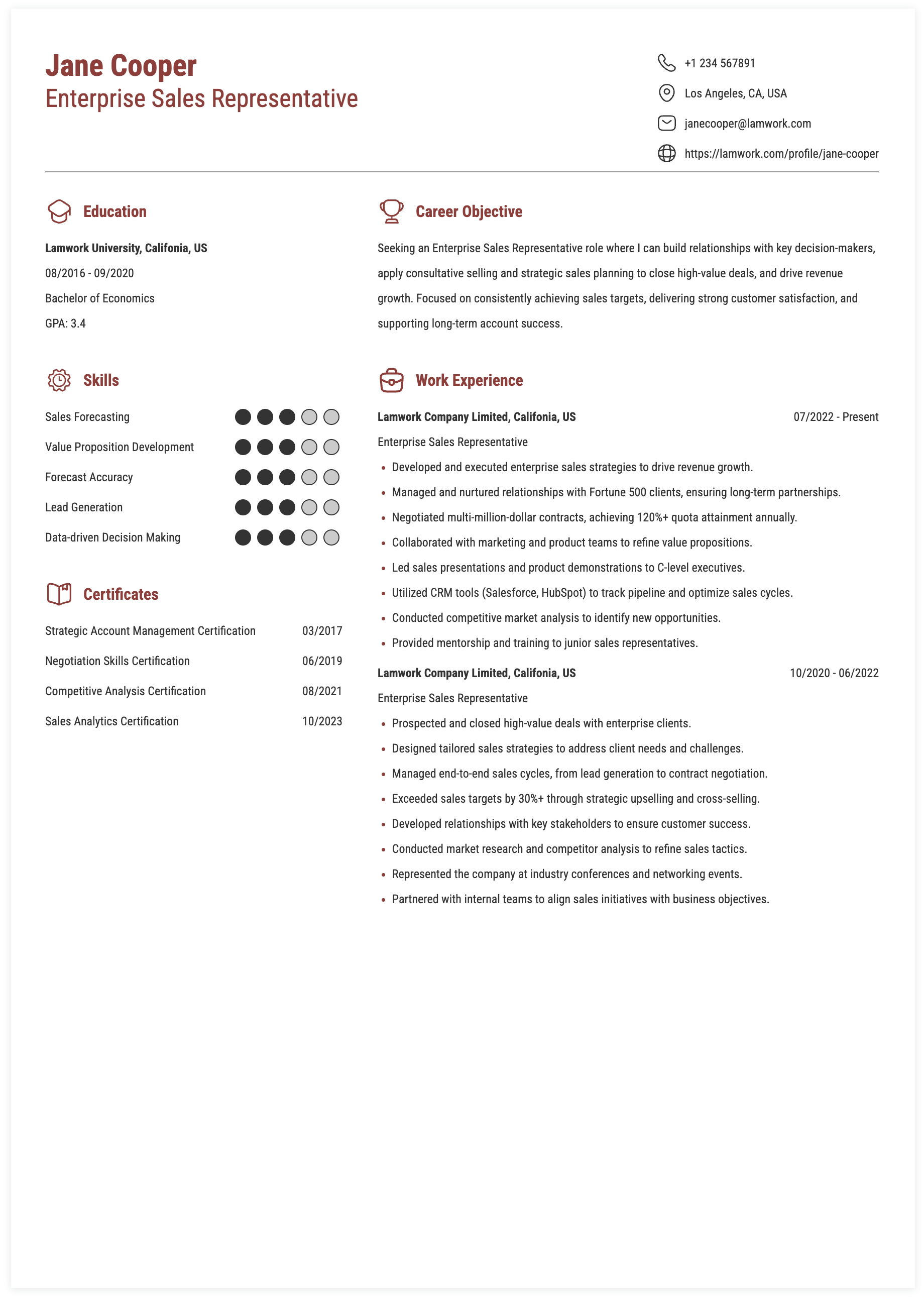 ENTERPRISE SALES REPRESENTATIVE RESUME EXAMPLE