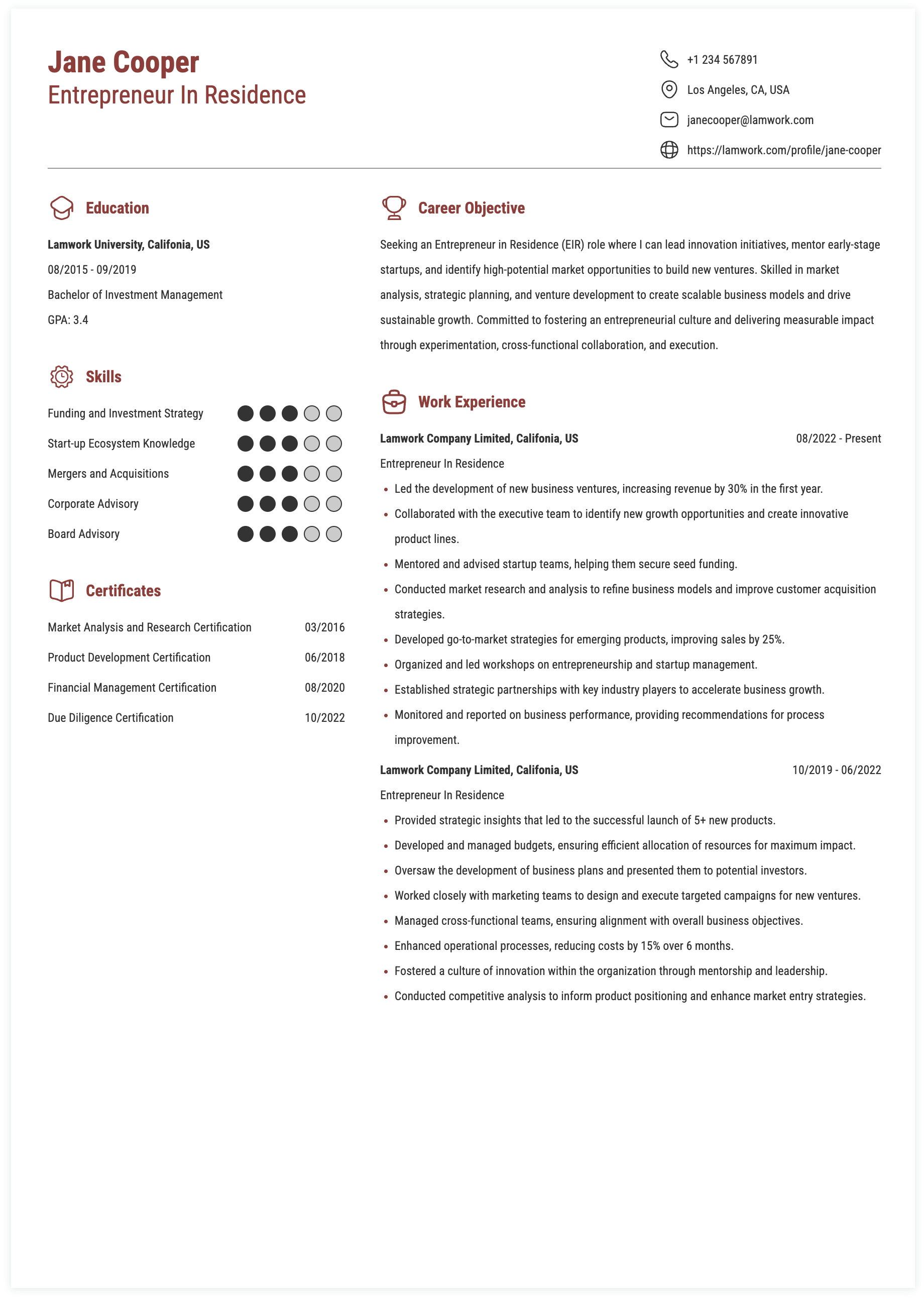 ENTREPRENEUR IN RESIDENCE RESUME EXAMPLE