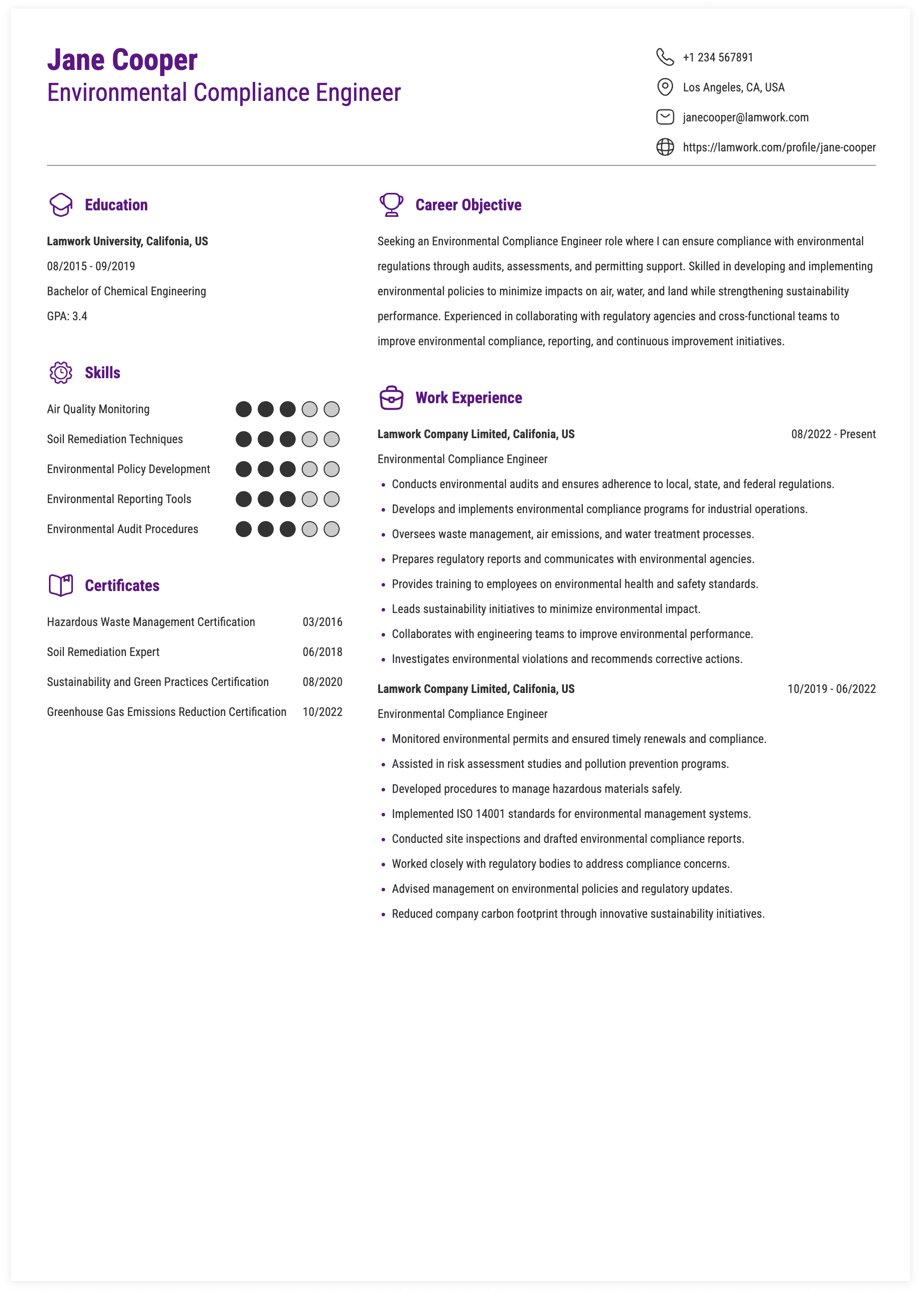 ENVIRONMENTAL COMPLIANCE ENGINEER RESUME EXAMPLE