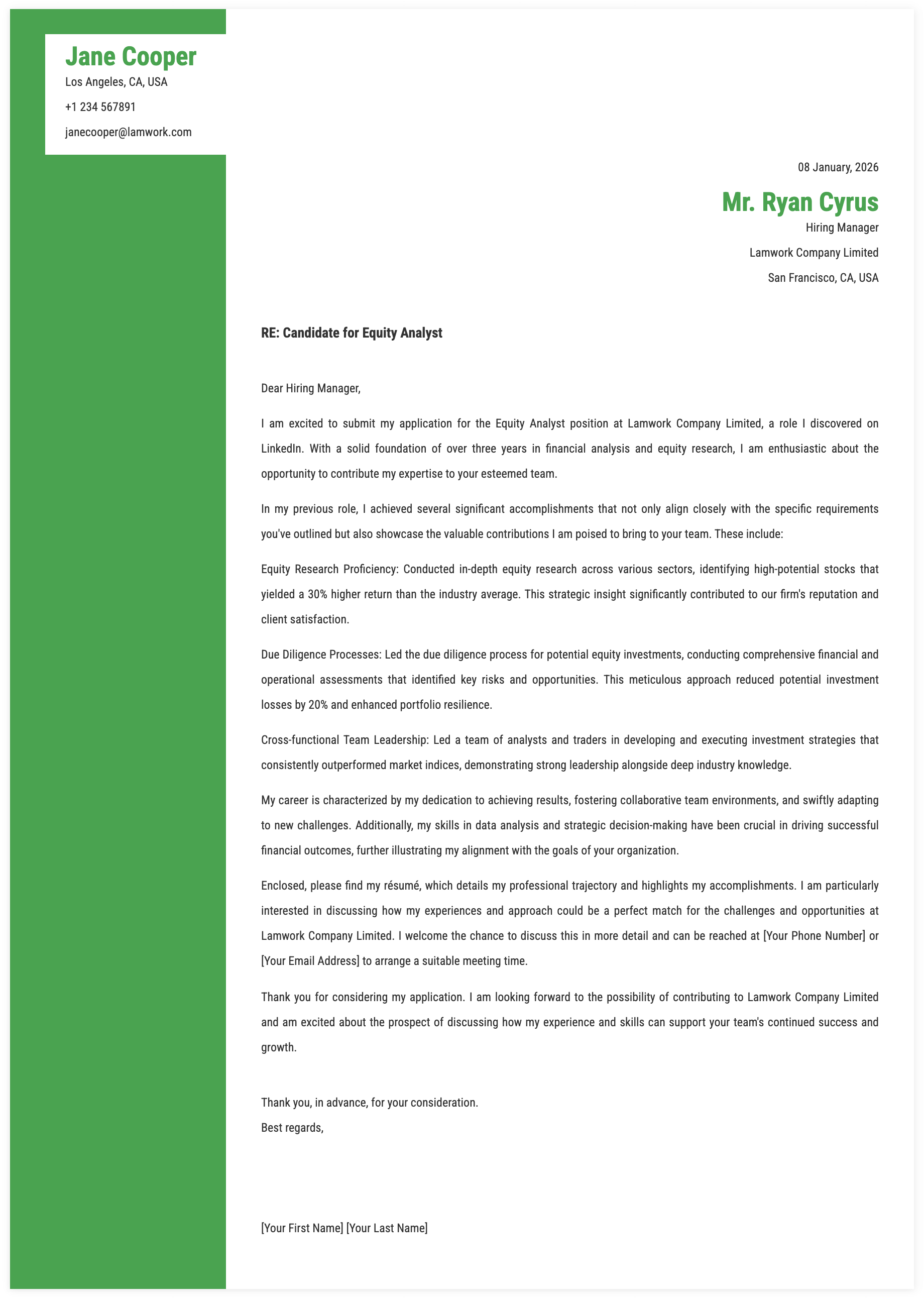 1. Details for Equity and Investment Analyst Cover Letter