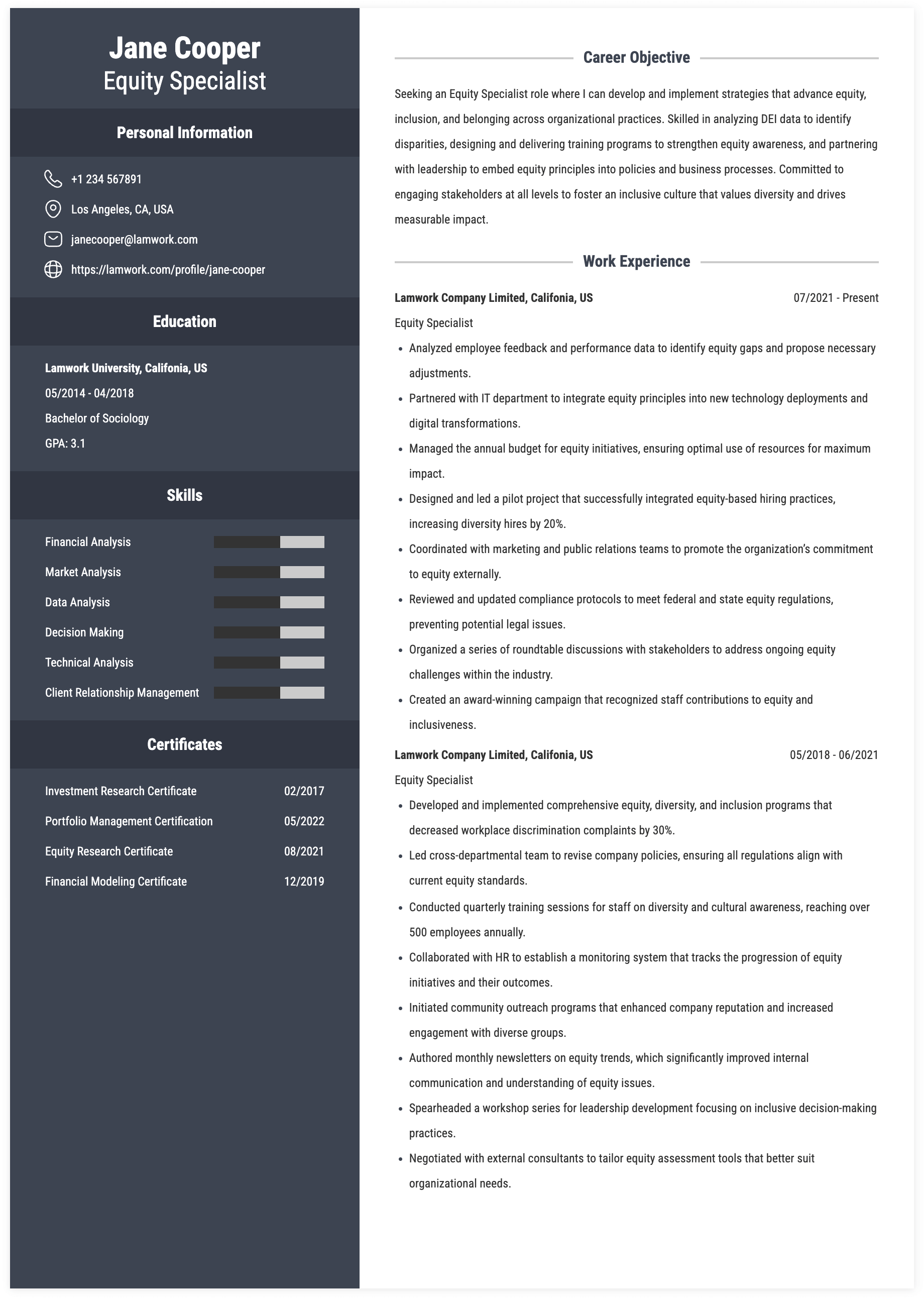 EQUITY SPECIALIST RESUME EXAMPLE