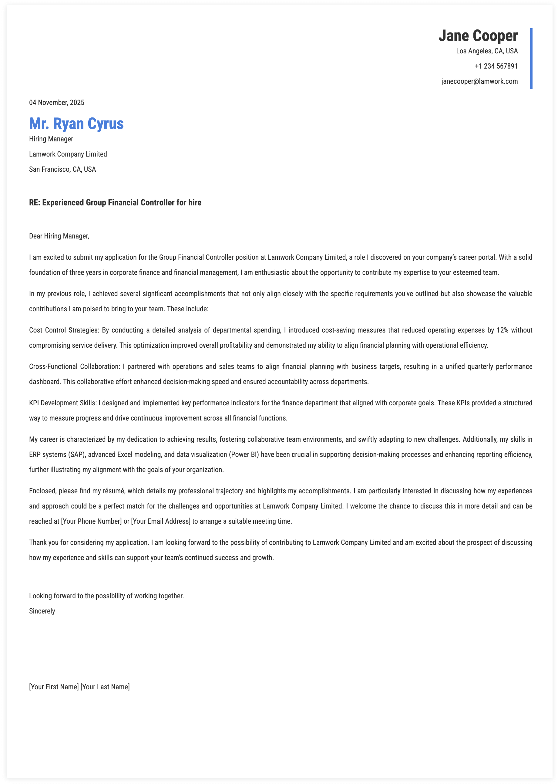 2. Expectations for Group Financial Controller Cover Letter