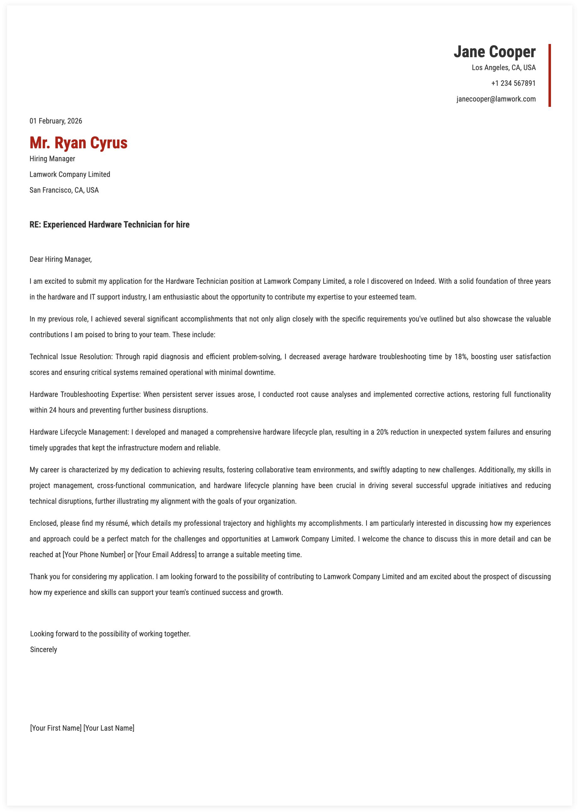 I am applying for the Hardware Technician position at Lamwork Company Limited, which I learned about through a job posting. With 6 months of academic and internship experience in hardware testing and electronics labs, I executed hands-on tasks in soldering and basic diagnostics, contributing to 3 completed coursework projects delivered on schedule.