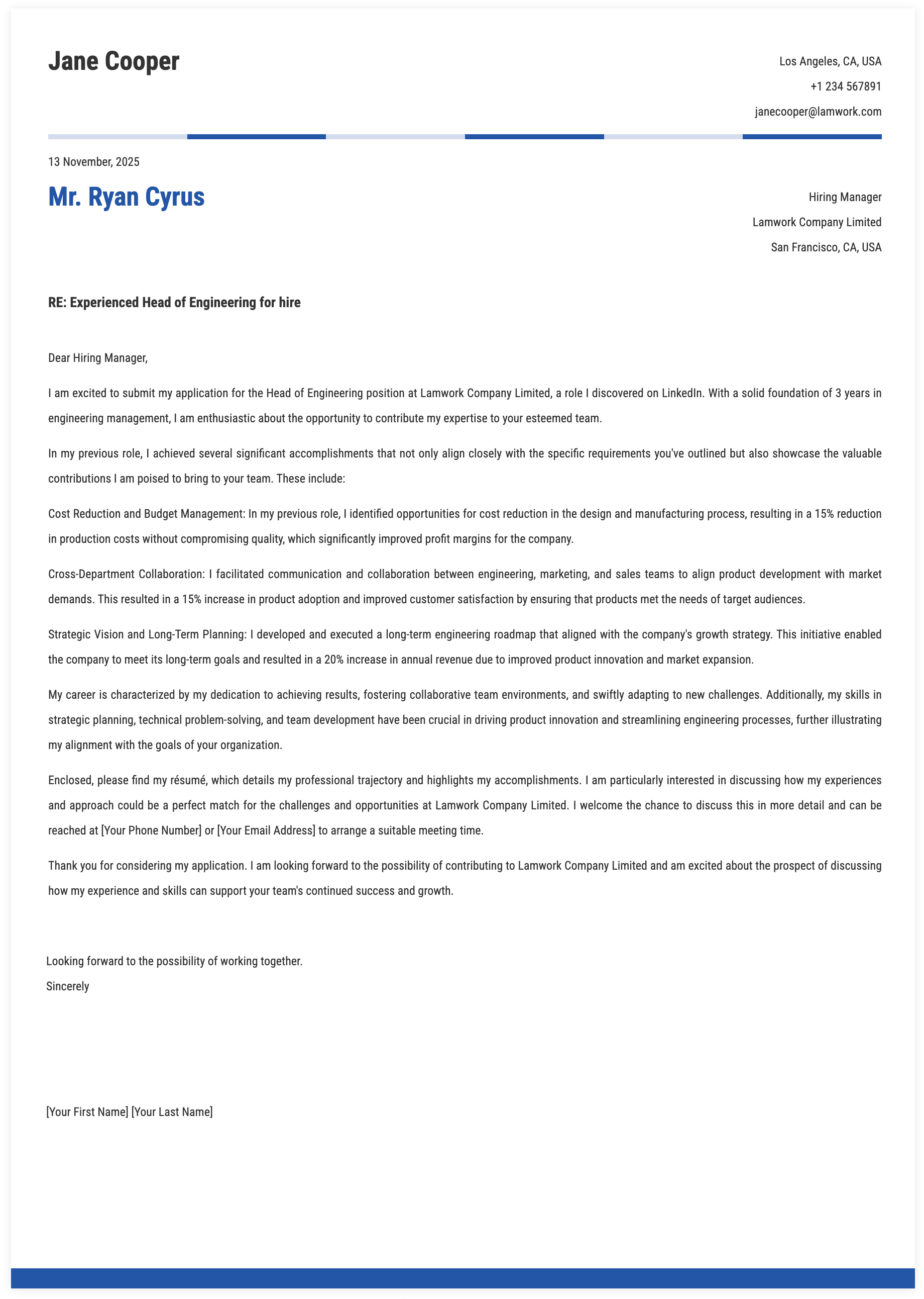 1. Details for Head of Engineering Cover Letter
