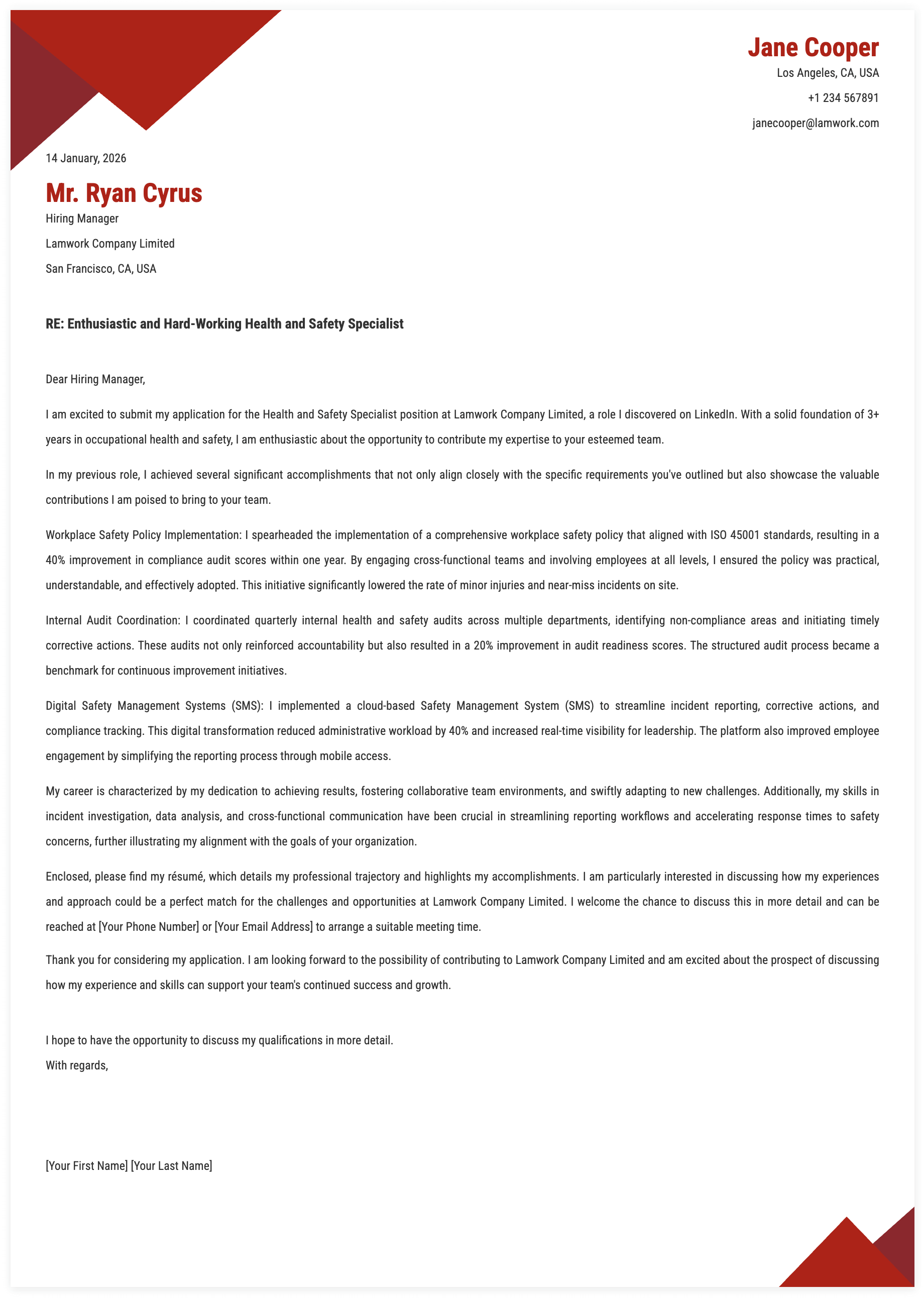 1. Details for Health and Safety Specialist Cover Letter