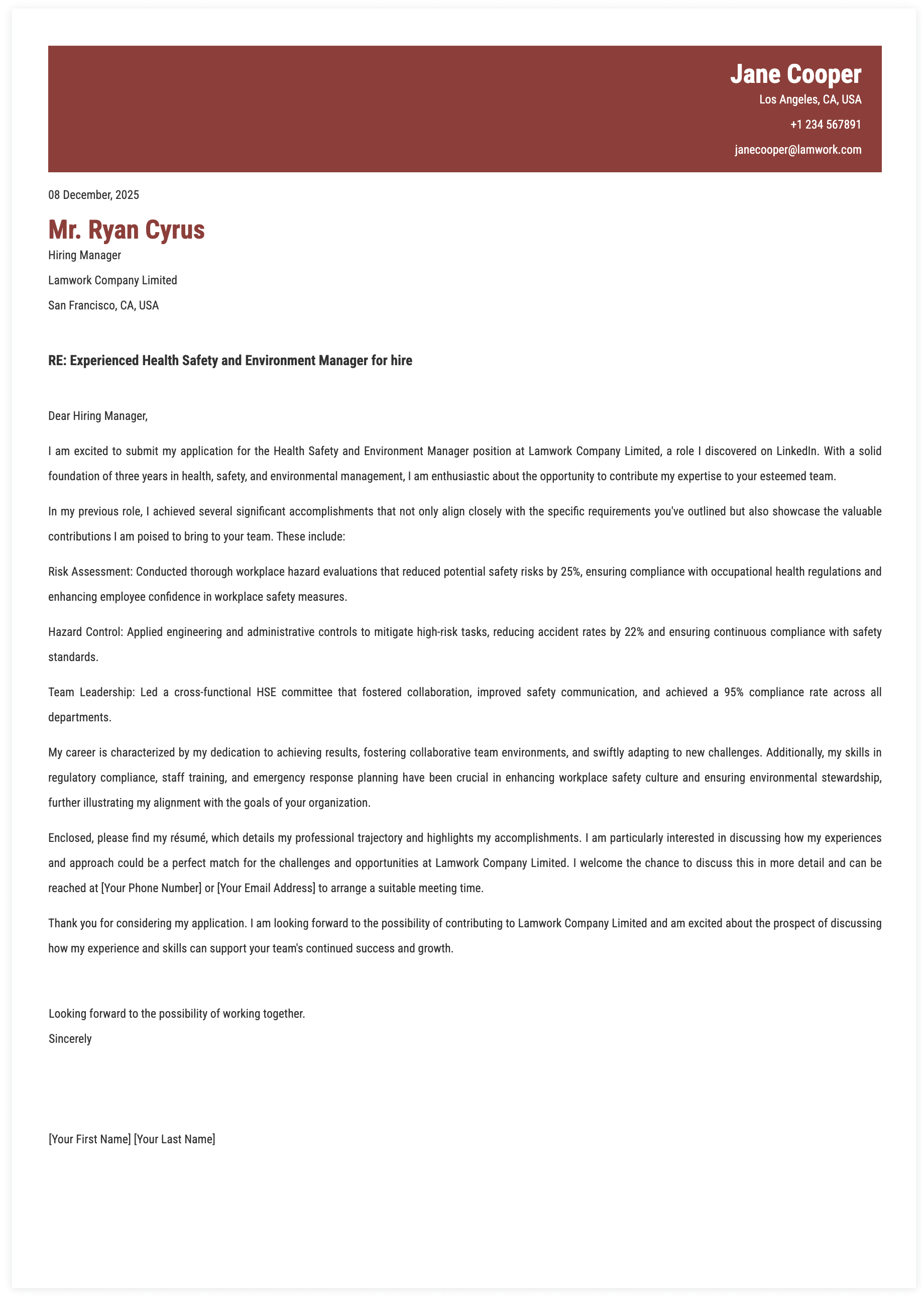 An Introduction to Professional Skills and Functions for Health Safety and Environment Manager with a Cover Letter