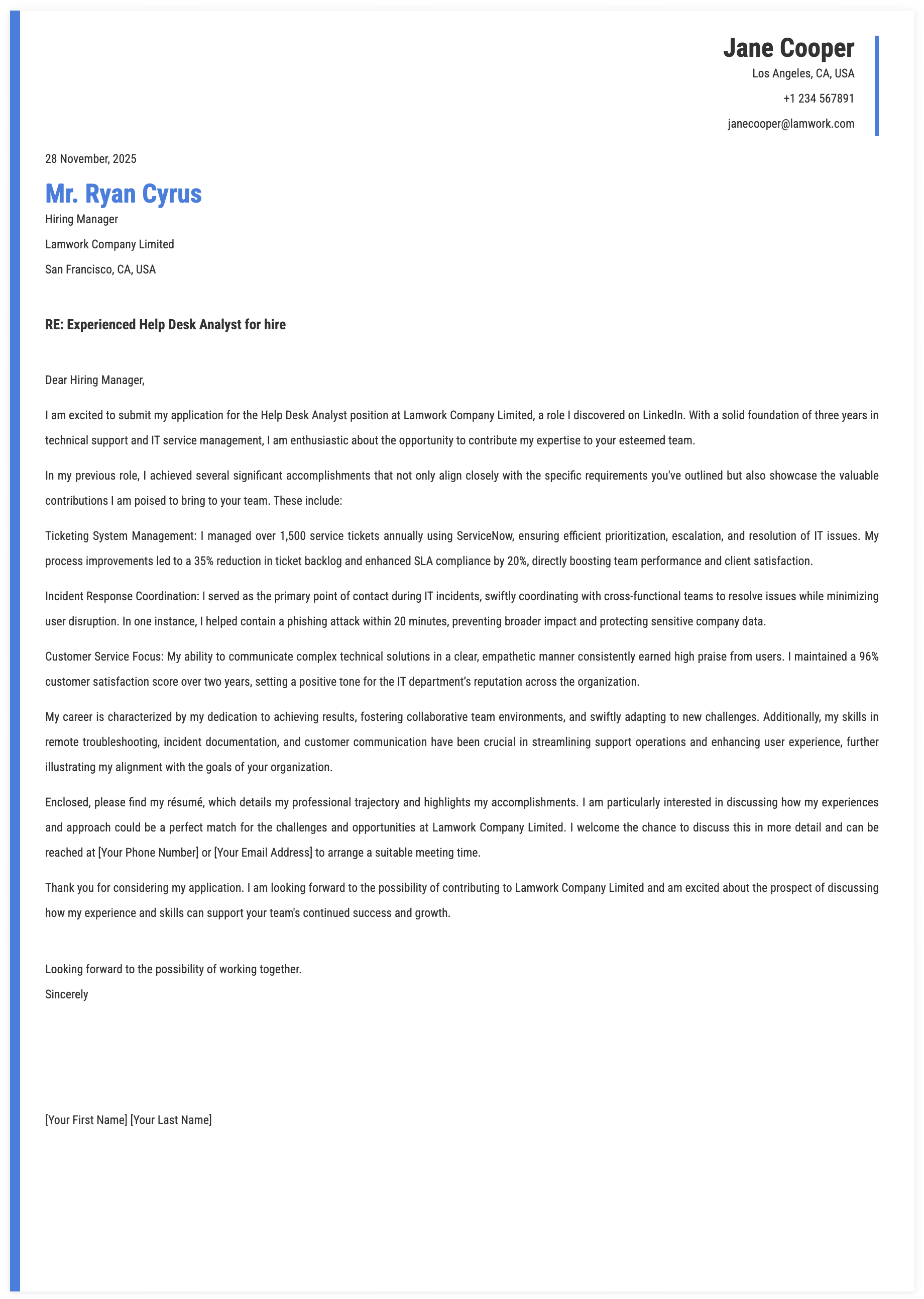 5. Primary Focus for Help Desk Analyst Cover Letter