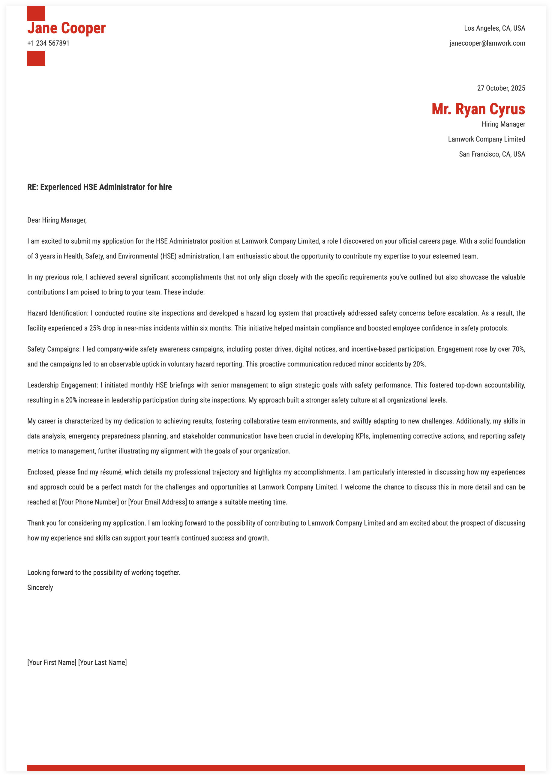 1. Accomplishments for HSE Administrator Cover Letter