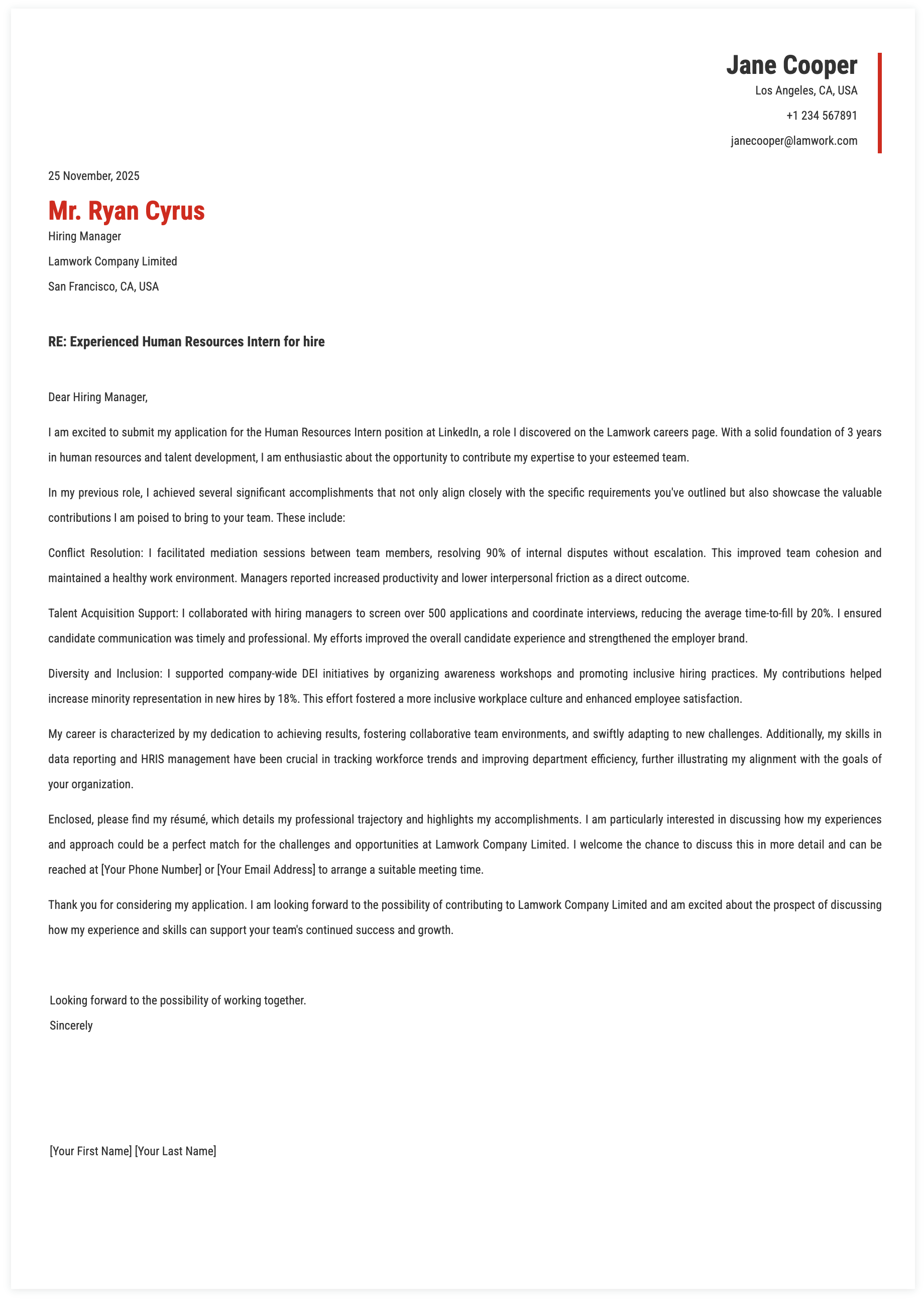 An Introduction to Professional Skills and Functions for Human Resources Intern with a Cover Letter