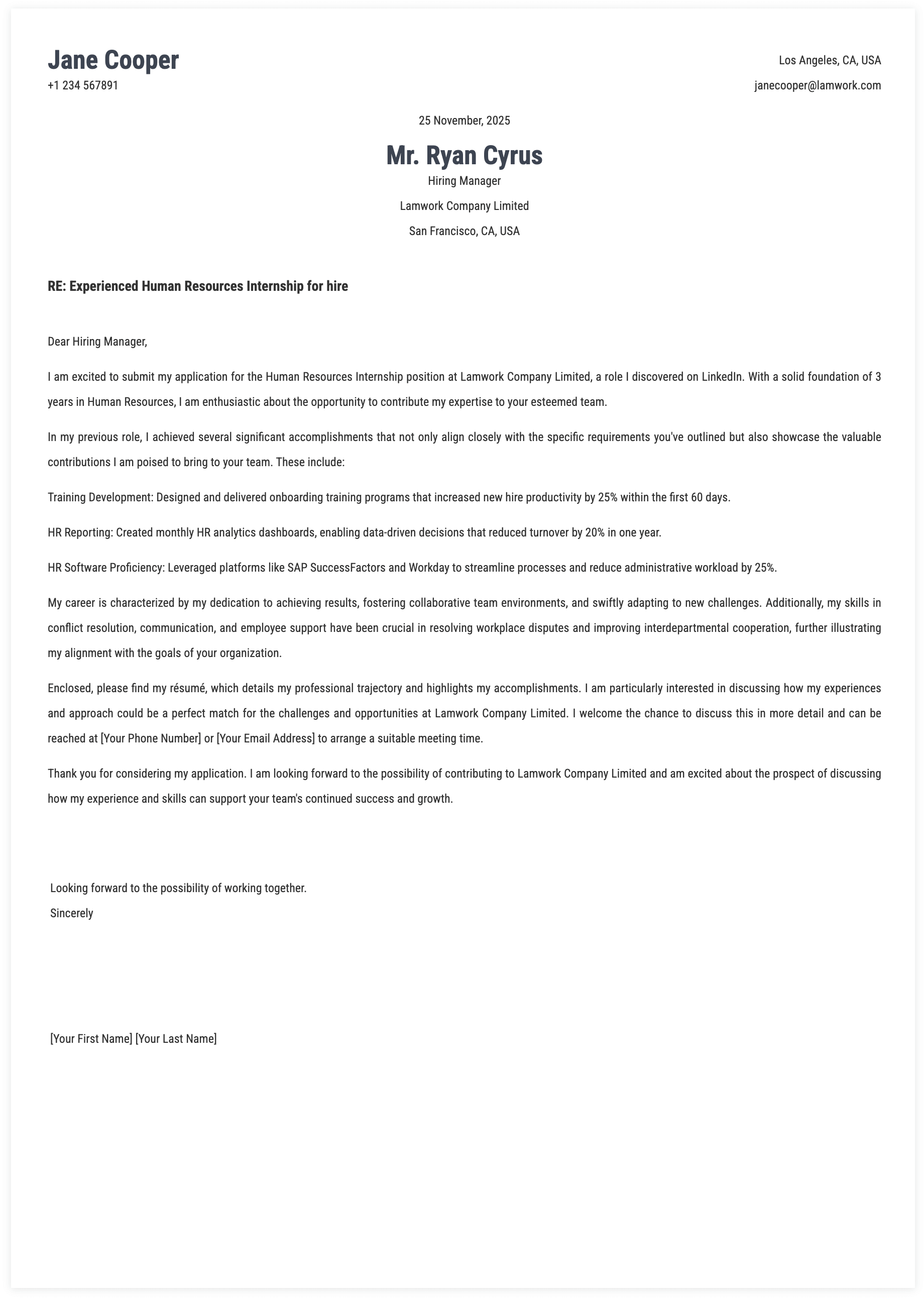 1. Details for Human Resources Internship Cover Letter