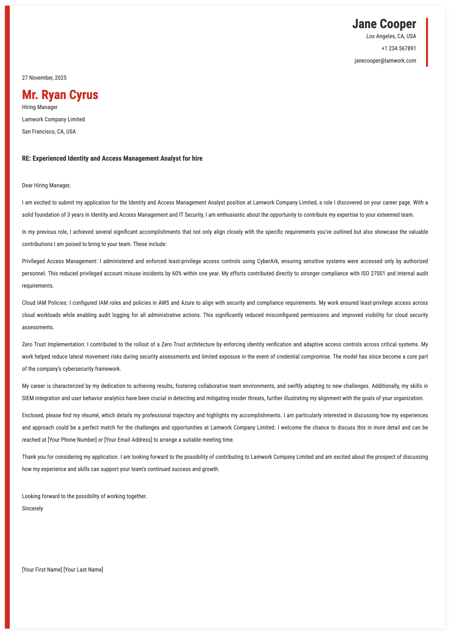 2. Key Deliverables for Identity and Access Management Analyst Cover Letter