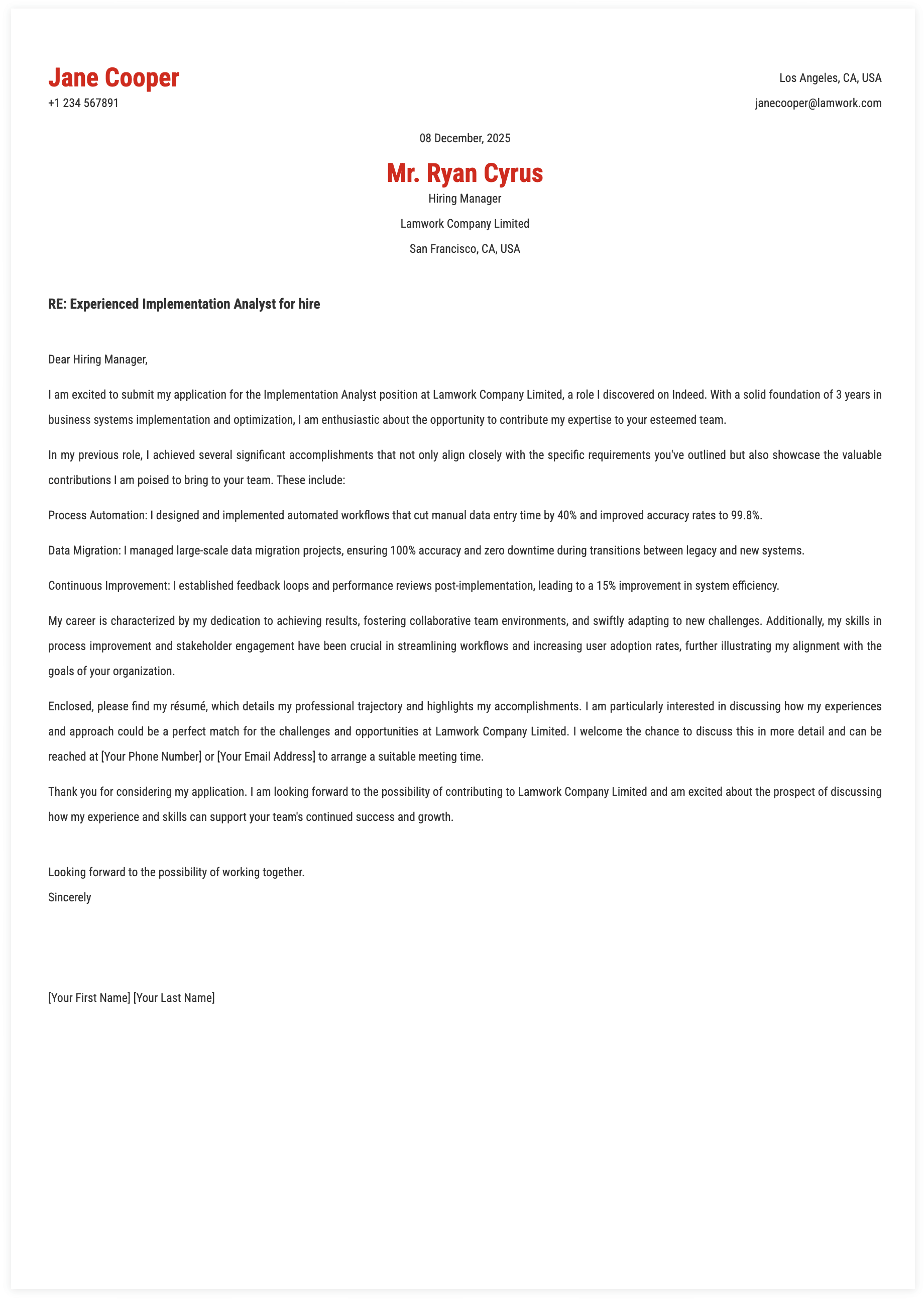 1. Details for Implementation Analyst Cover Letter