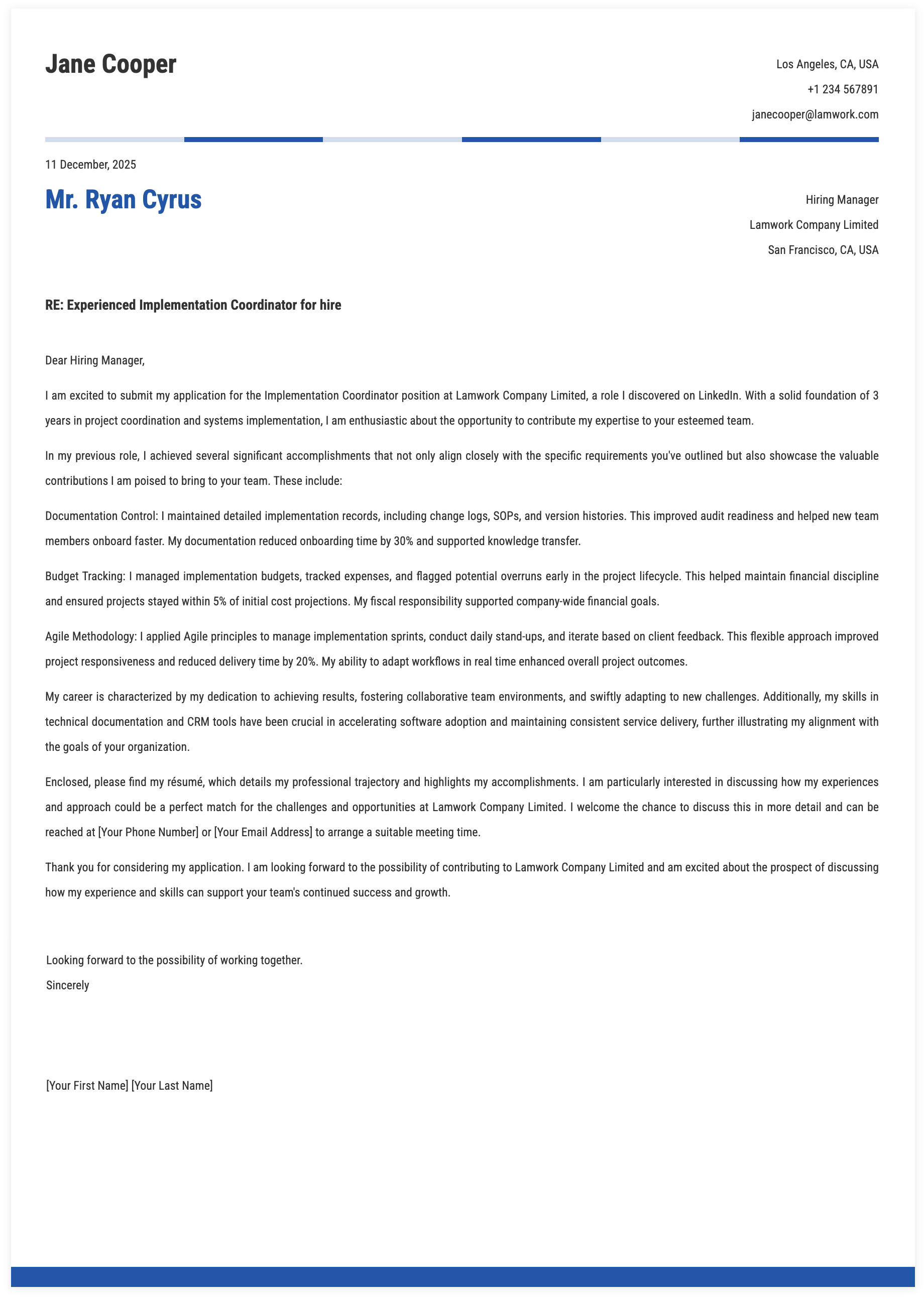 16. Experience and Requirements for Implementation Coordinator Cover Letter