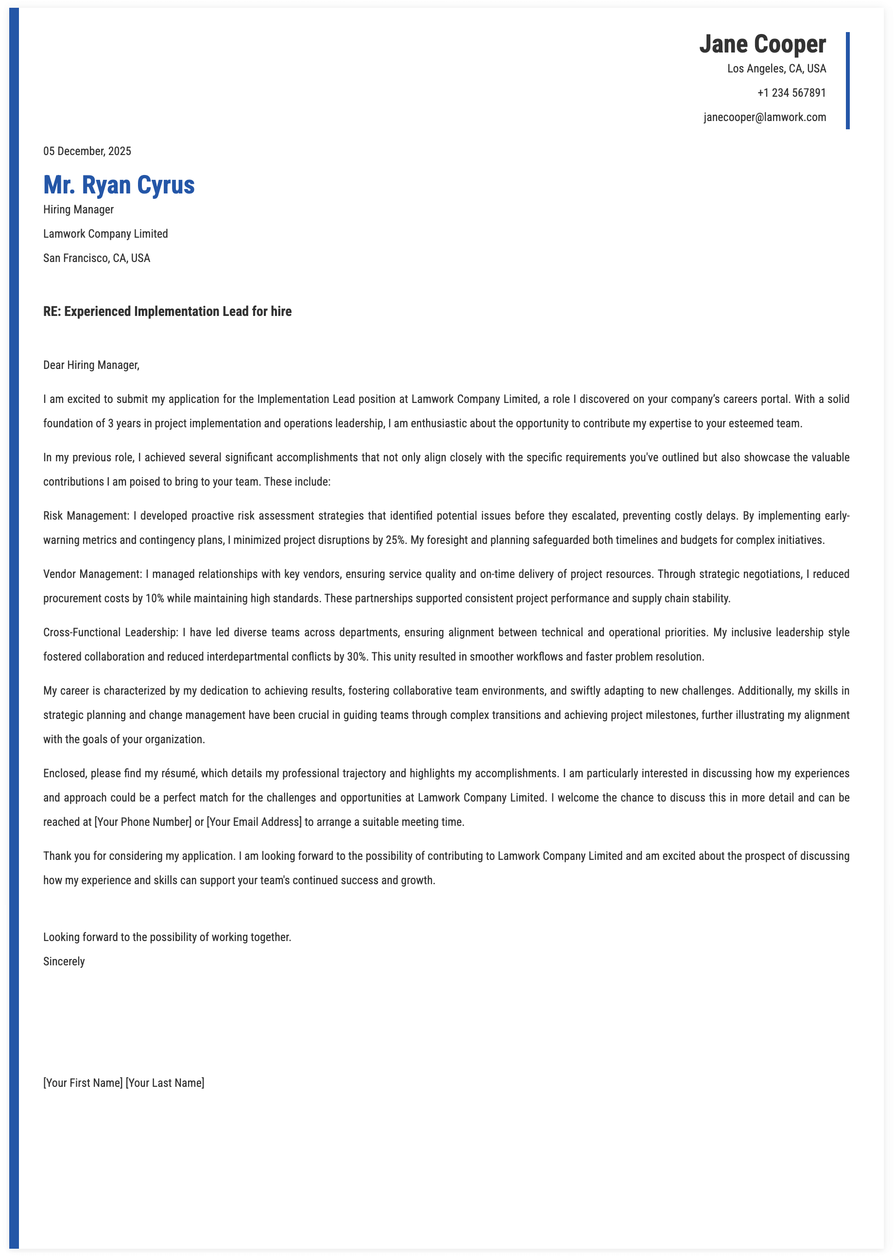 An Introduction to Professional Skills and Functions for Implementation Lead with a Cover Letter