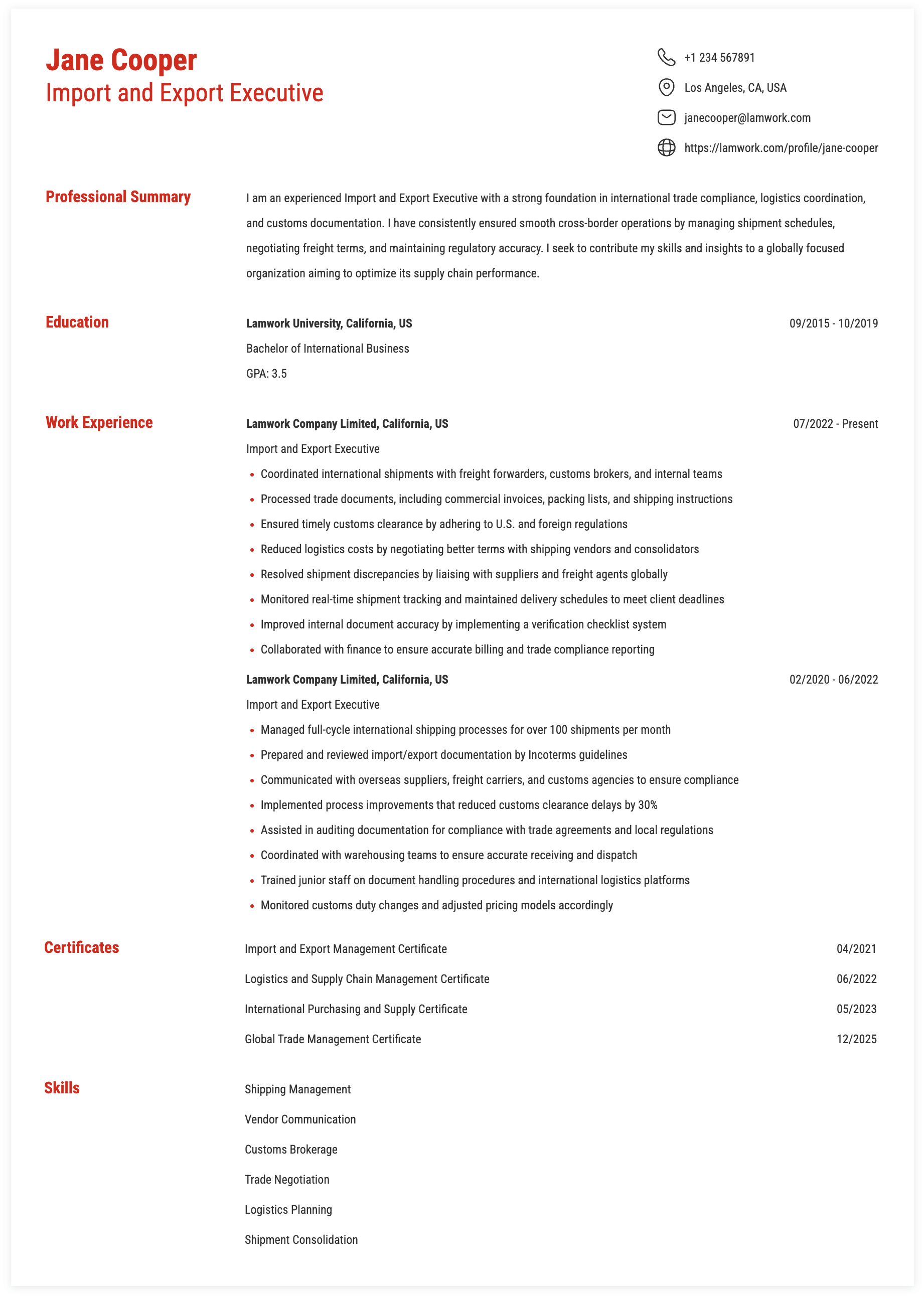 IMPORT AND EXPORT EXECUTIVE RESUME EXAMPLE