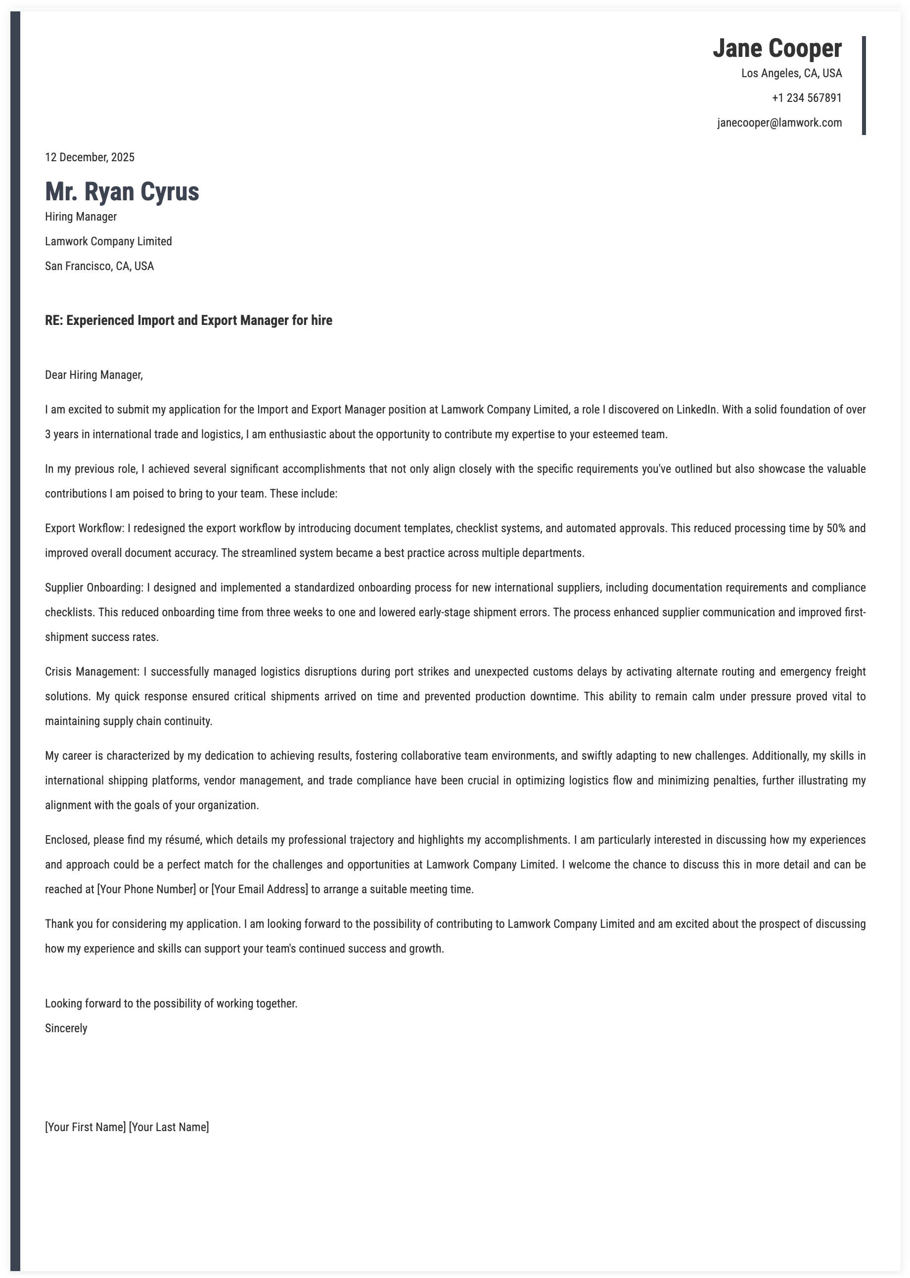 1. Details for Import and Export Manager Cover Letter