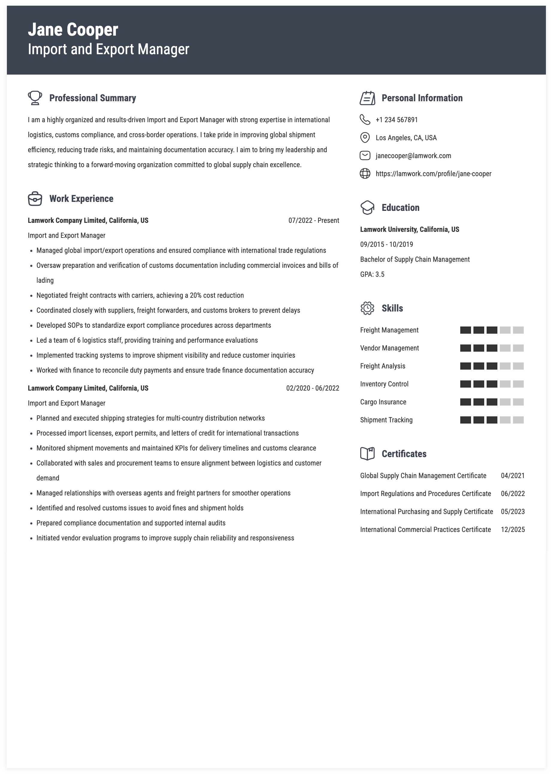 IMPORT AND EXPORT MANAGER RESUME EXAMPLE