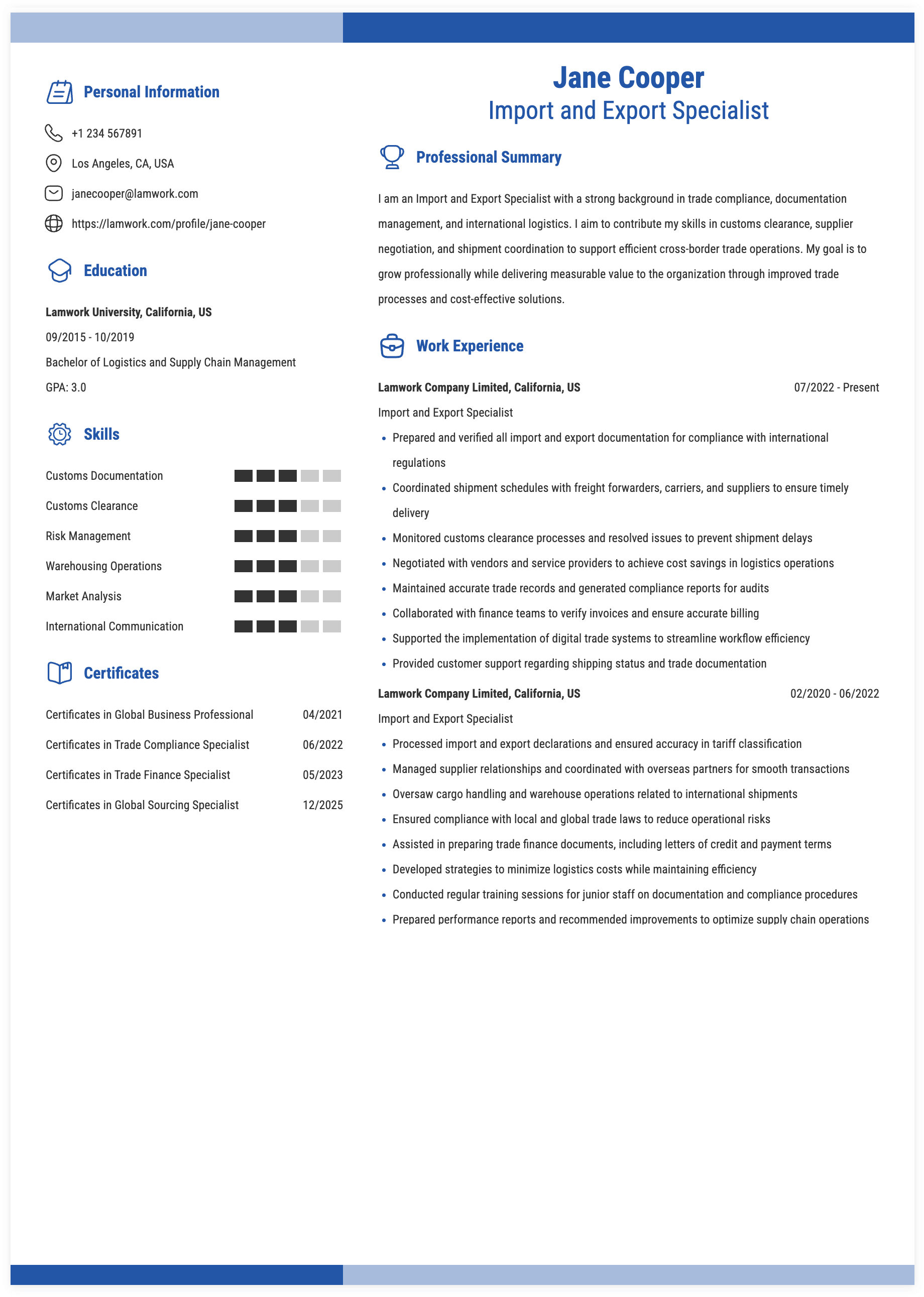 3. Import and Export Specialist, Pacific Horizon Shipping, Tacoma, WA