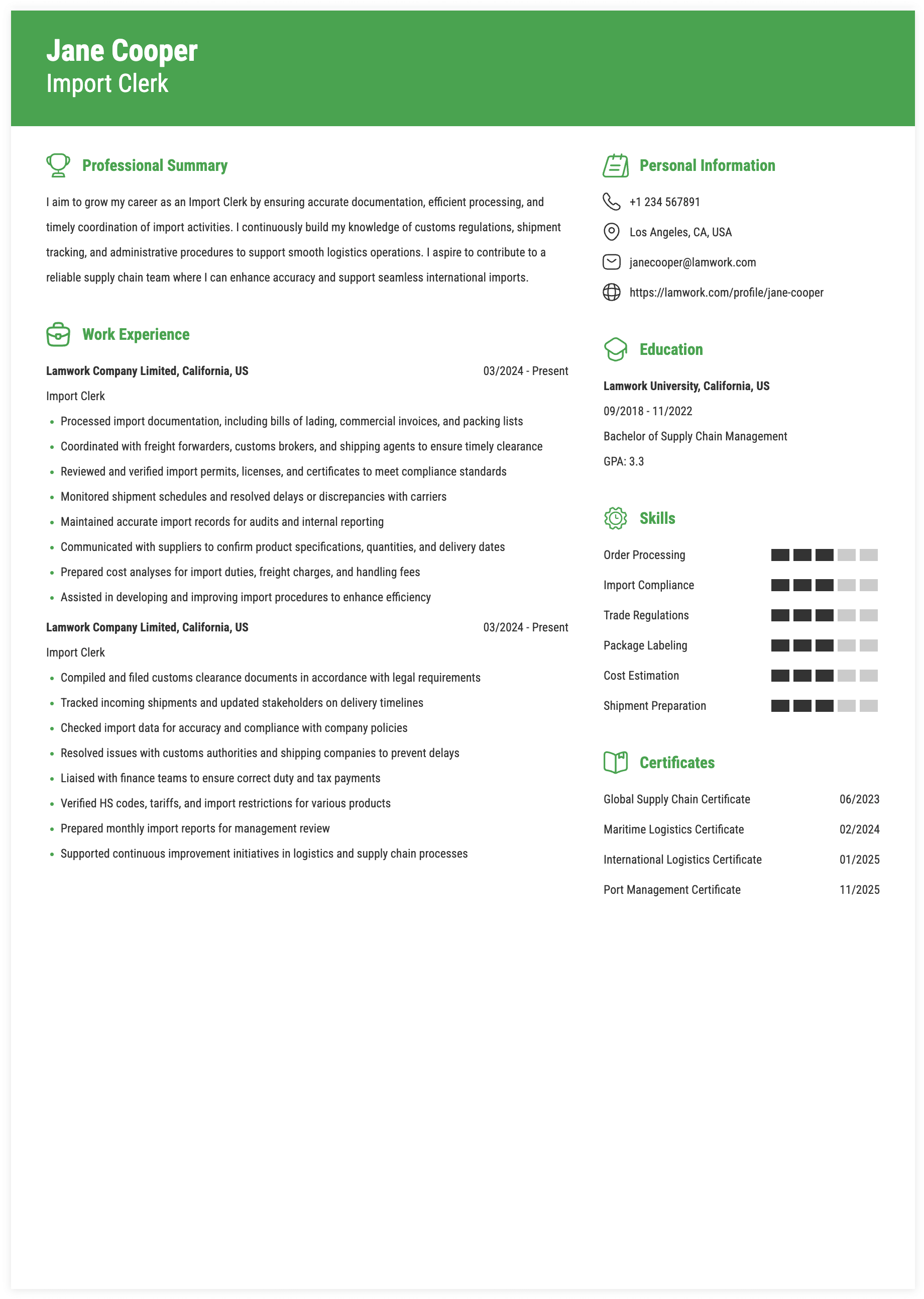 Updated: Dec 08, 2025 - The Import Clerk prepares and processes customs documentation, including special authorization applications, and manages customer communications to obtain required data for import procedures. This role involves scanning, entering, and maintaining records in enterprise systems, managing international inventory and deadlines, and ensuring accurate calculation of surcharges. The clerk also oversees customs clearance processes, prepares related declarations, and updates internal reports to support efficient import operations.
