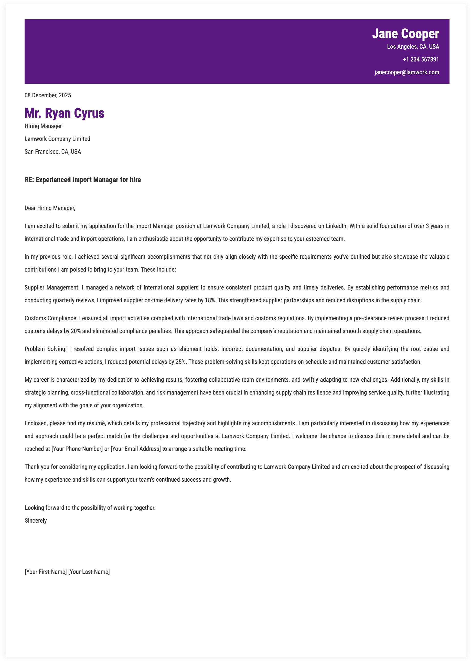 An Introduction to Professional Skills and Functions for Import Manager with a Cover Letter