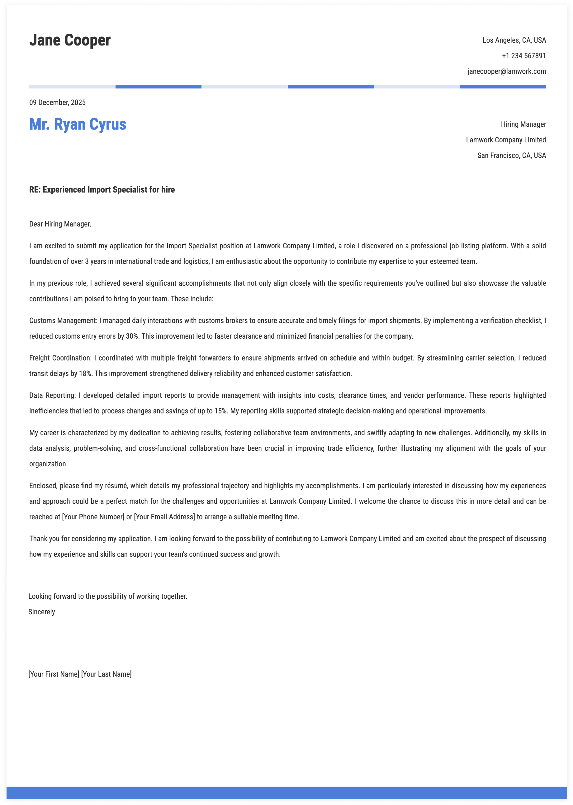 1. Details for Import Specialist Cover Letter