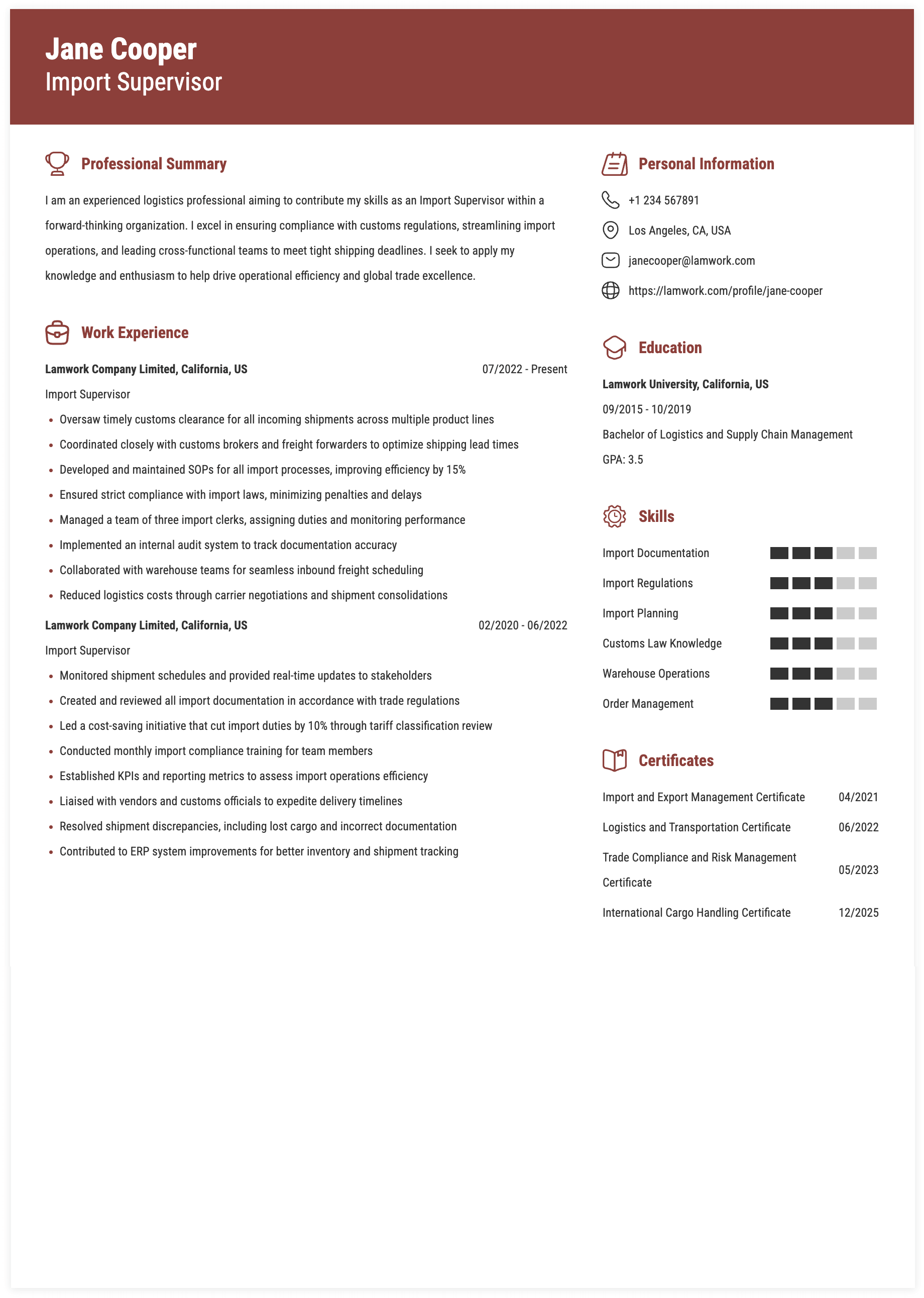 - Supervise and assist in daily import activities, resolving complaints, ensuring the timeliness of work completion and re-prioritizing of work flow in critical situations