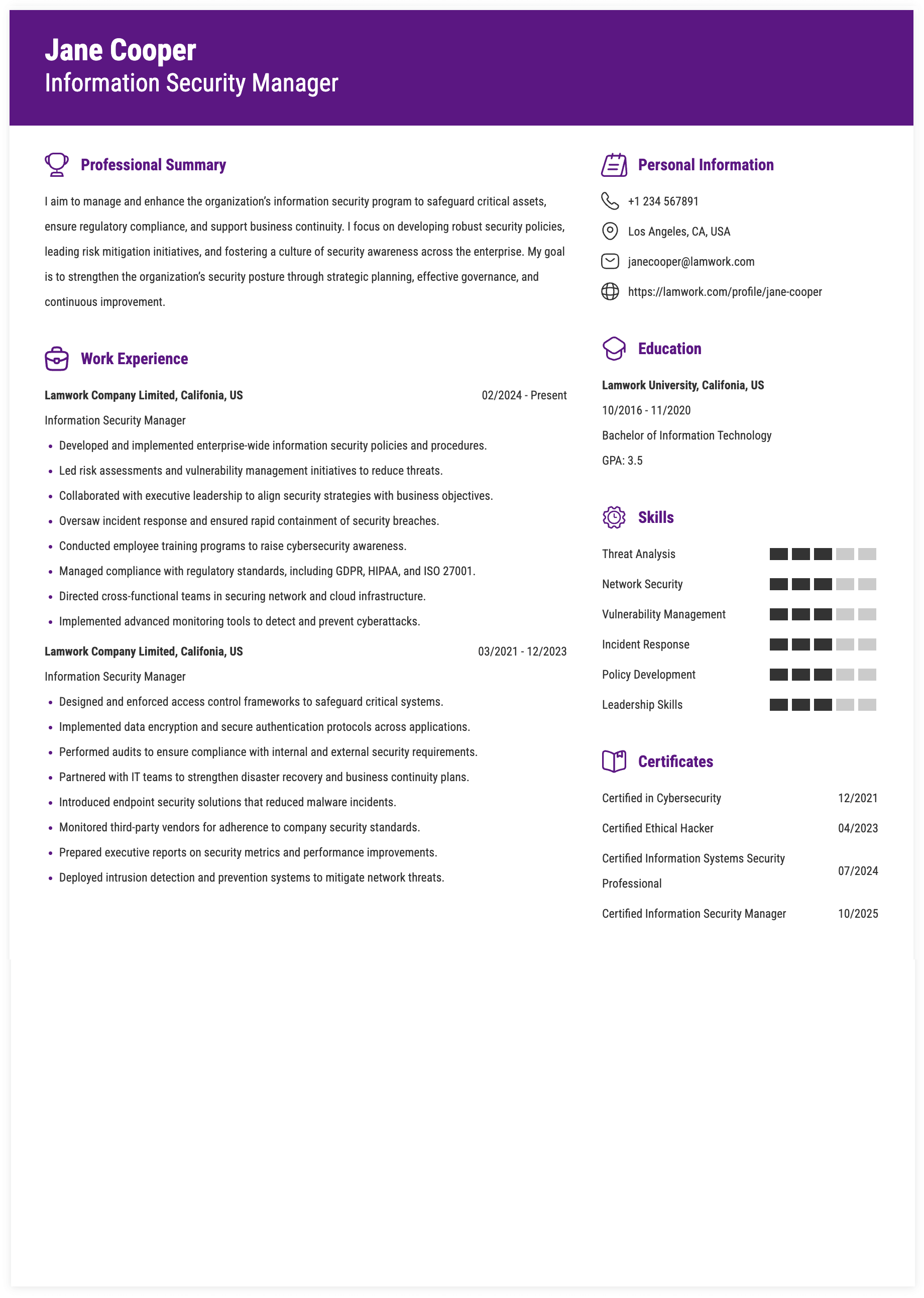 - Manage the corporate-wide Information Security awareness program.