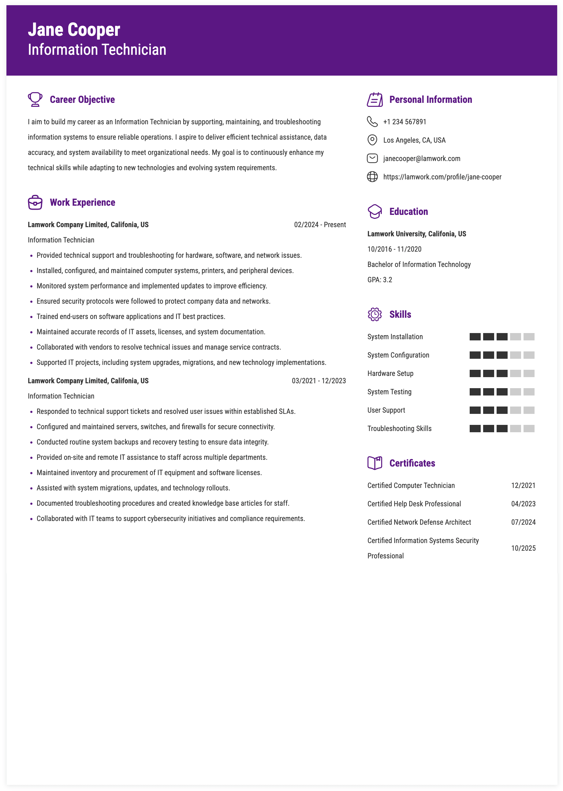 Updated: Jan 09, 2026 - The Information Technician is responsible for installing, maintaining, and troubleshooting computer systems, networks, and related hardware and software to ensure smooth business operations. This position provides technical support to users, resolves system errors, and implements updates or security measures to safeguard data and enhance efficiency. In addition, the technician documents IT processes, monitors system performance, and collaborates with other departments to improve technology solutions and support organizational goals.