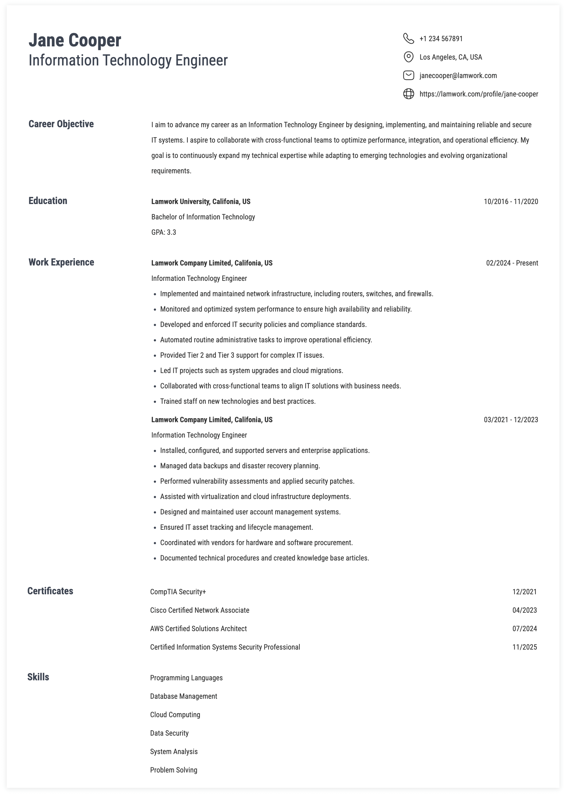 4. Information Technology Engineer, CloudCore IT Services, Phoenix, AZ