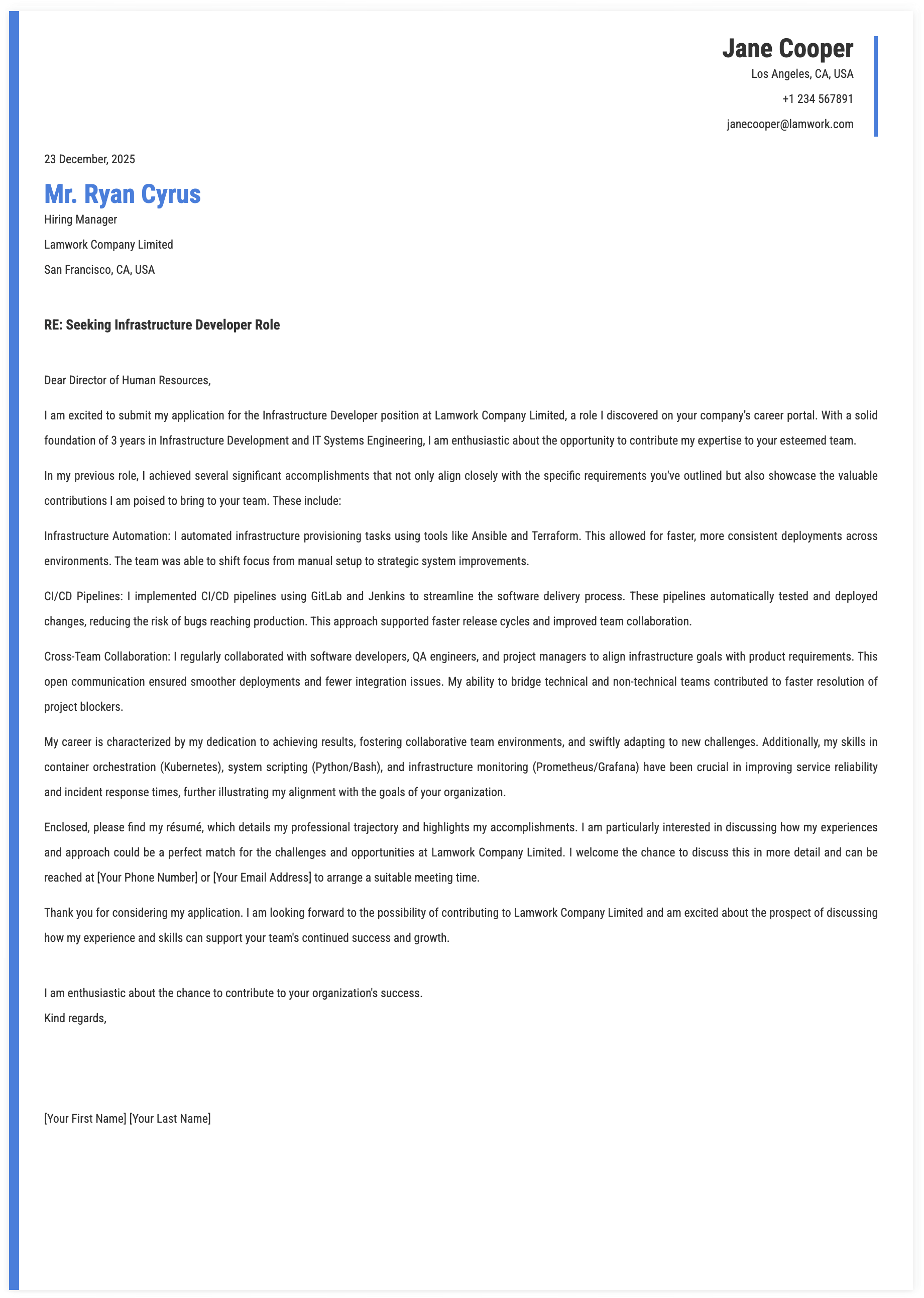 3. Key Deliverables for Infrastructure Developer Cover Letter